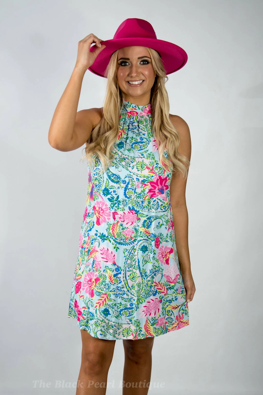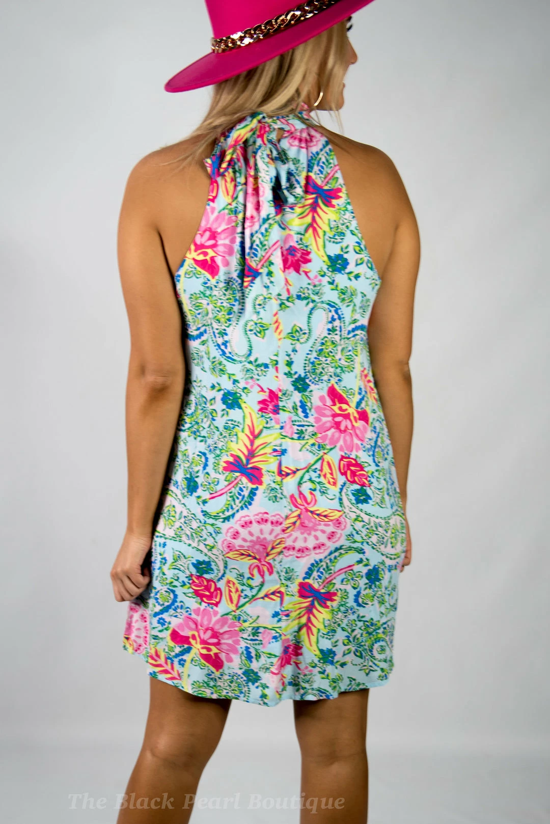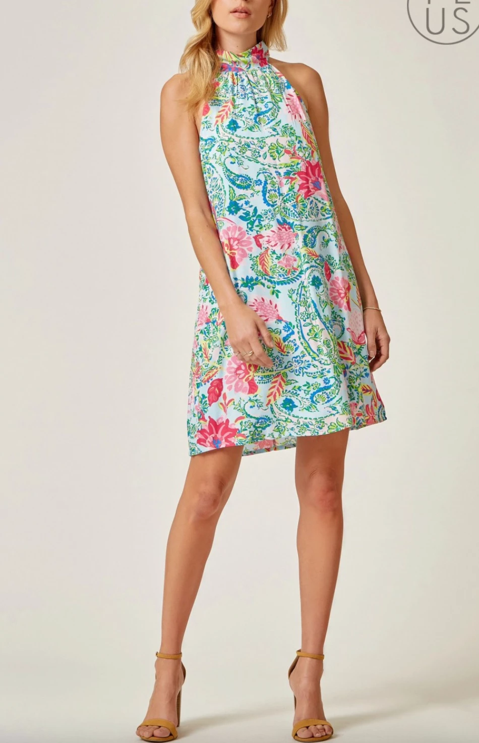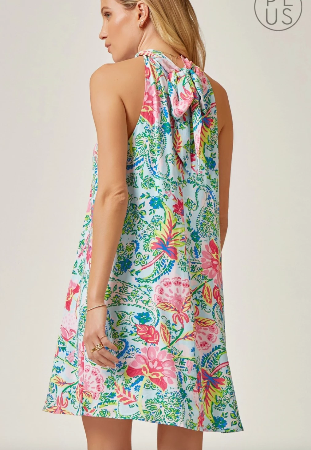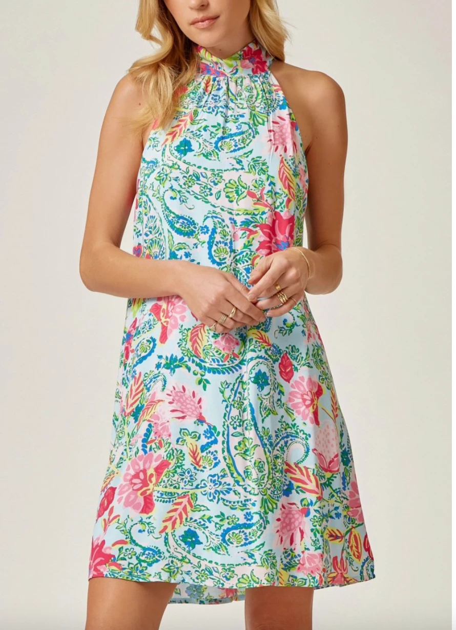 - High neck unique printed dress is the combination of romantic! We love the high neck detail with back tie on back. A line bodice.