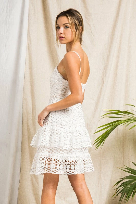 LACE TRIMMED SLEEVELESS RUFFLE DRESS MODEL IS 5'8" (32-24-34) WEARING A SMALL