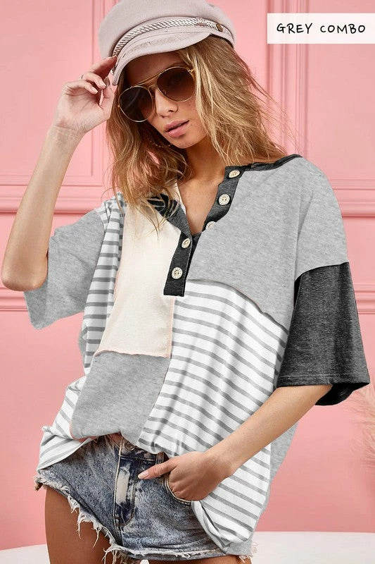 - TRIBLEND COLOR BLOCK WITH STRIPE AND CONTRAST STITCHING BUTTONED HENLEY TOP