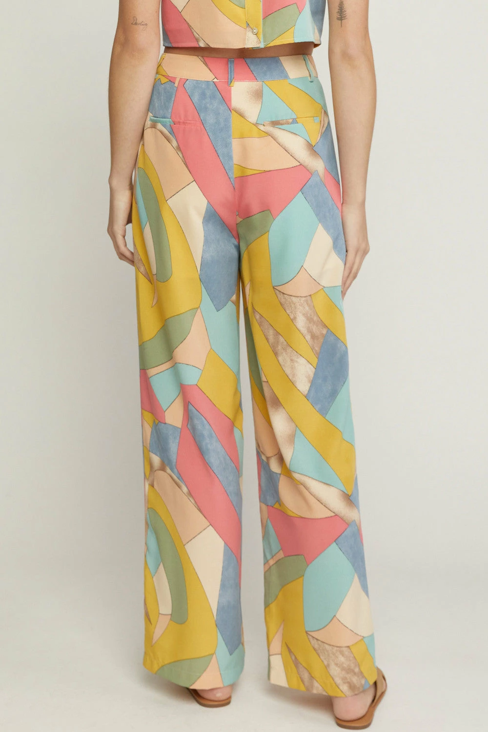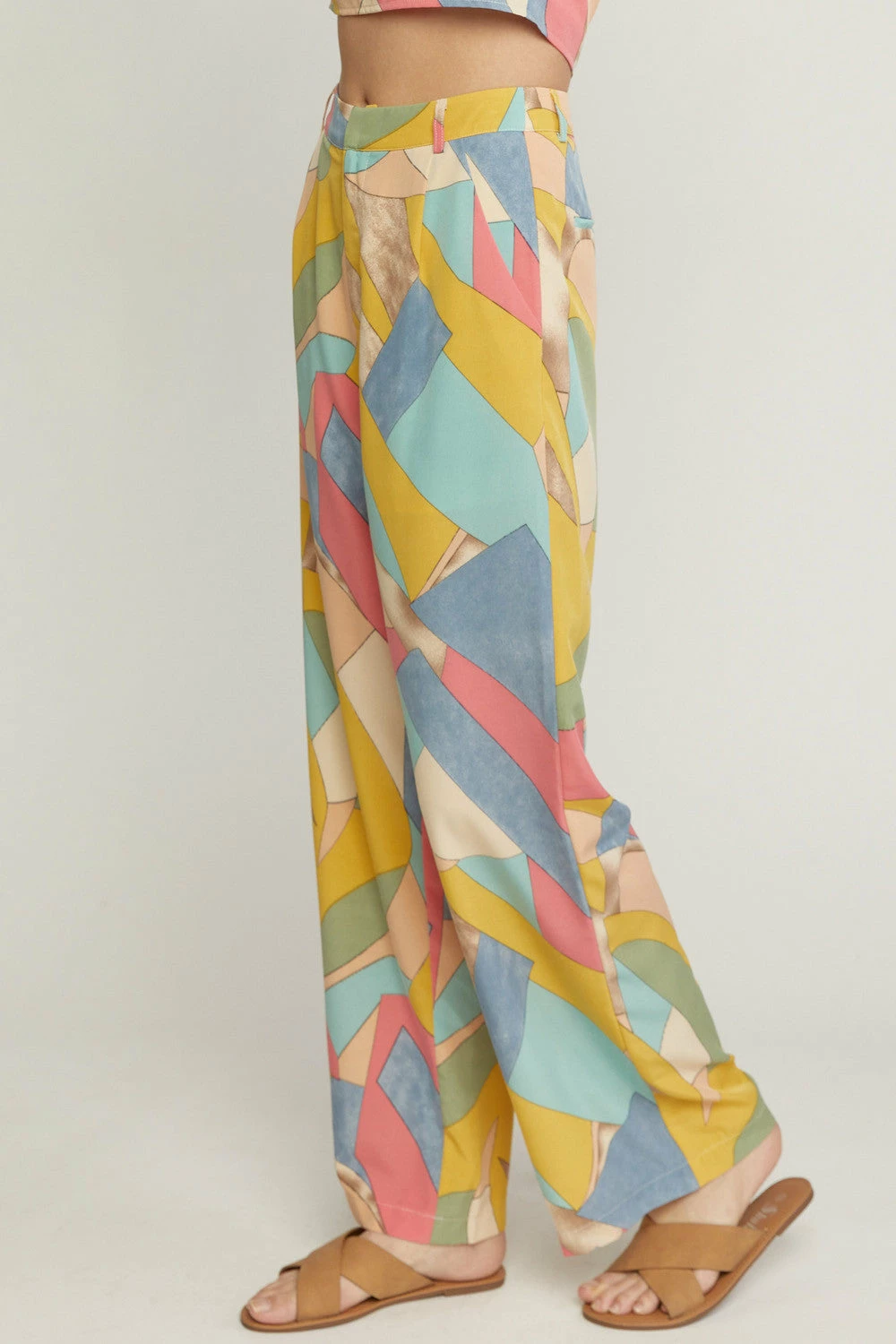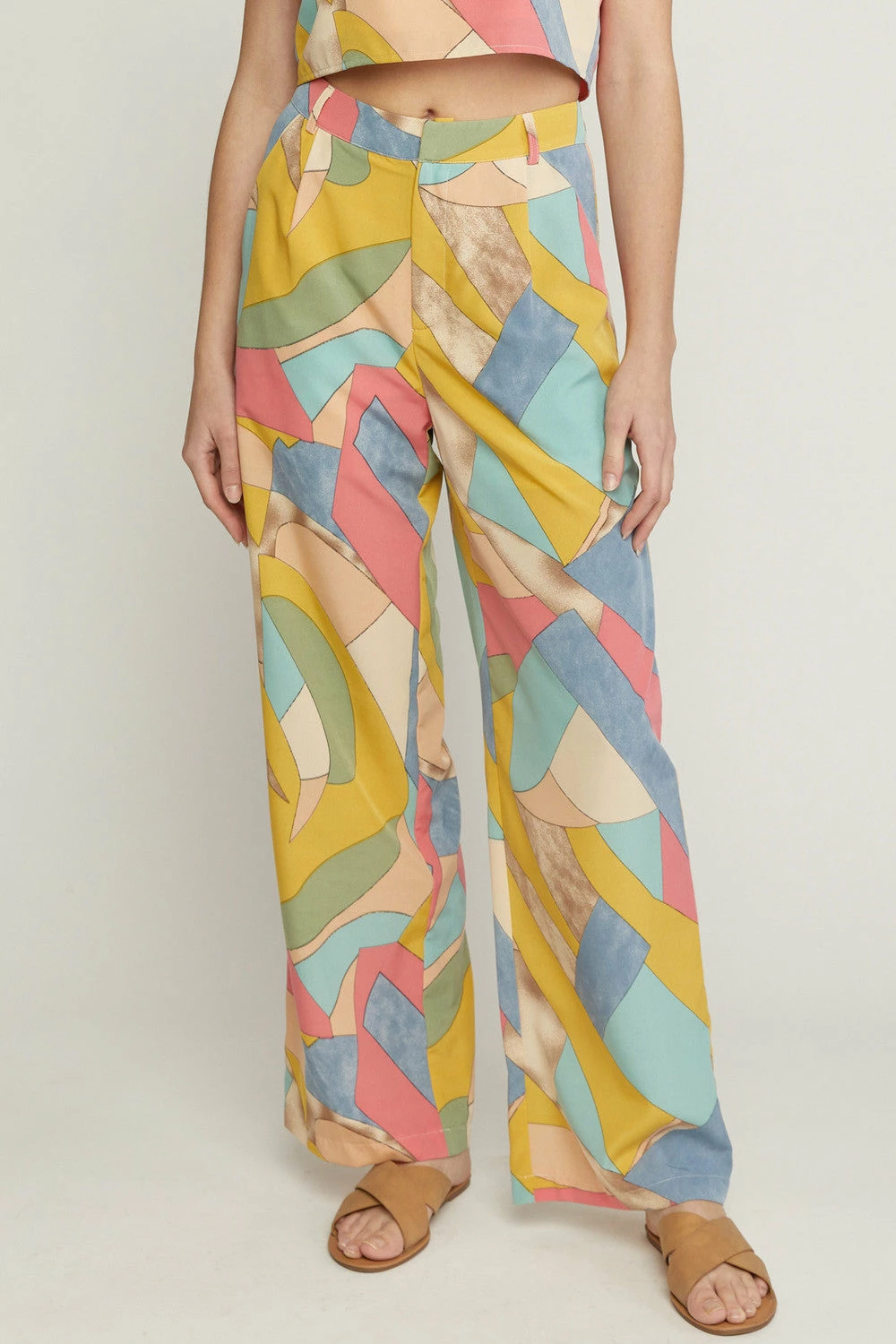 Abstract print wide leg pants featuring zipper front. Pockets at side. Lined. Woven. Non-sheer. Lightweight.
