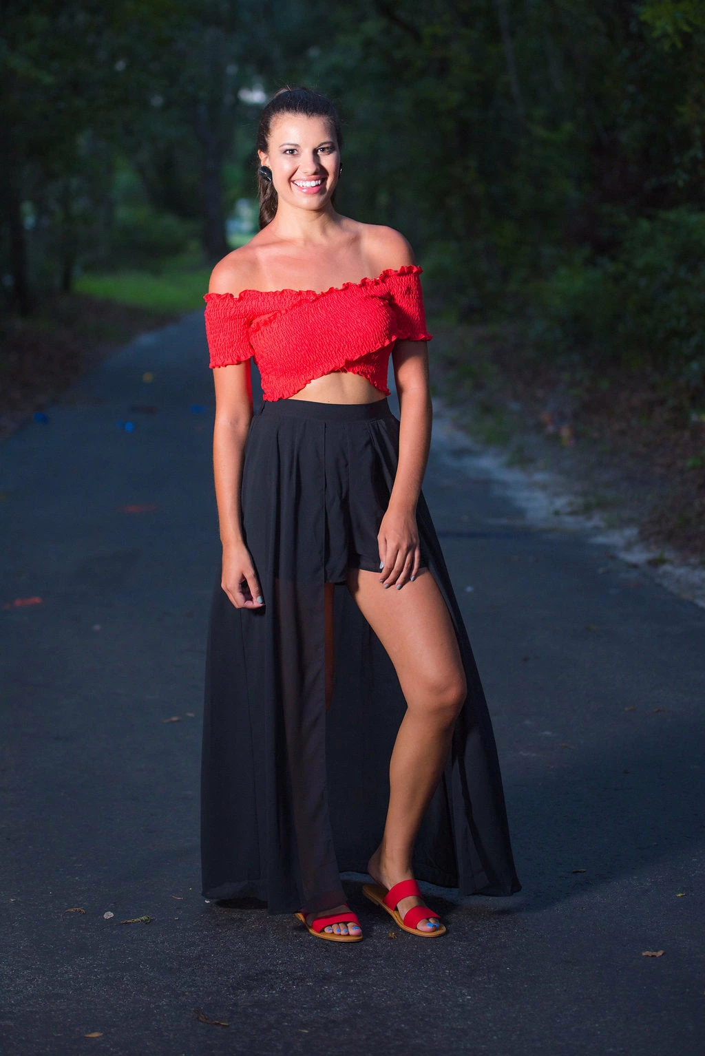 - Our black shorts with a maxi length skirt pannel is amazing and that one fun piece you need in your closet! Featuring an elastic waist. Perfect for game days, or even the perfect fall piece to pair with booties and your favorite top!