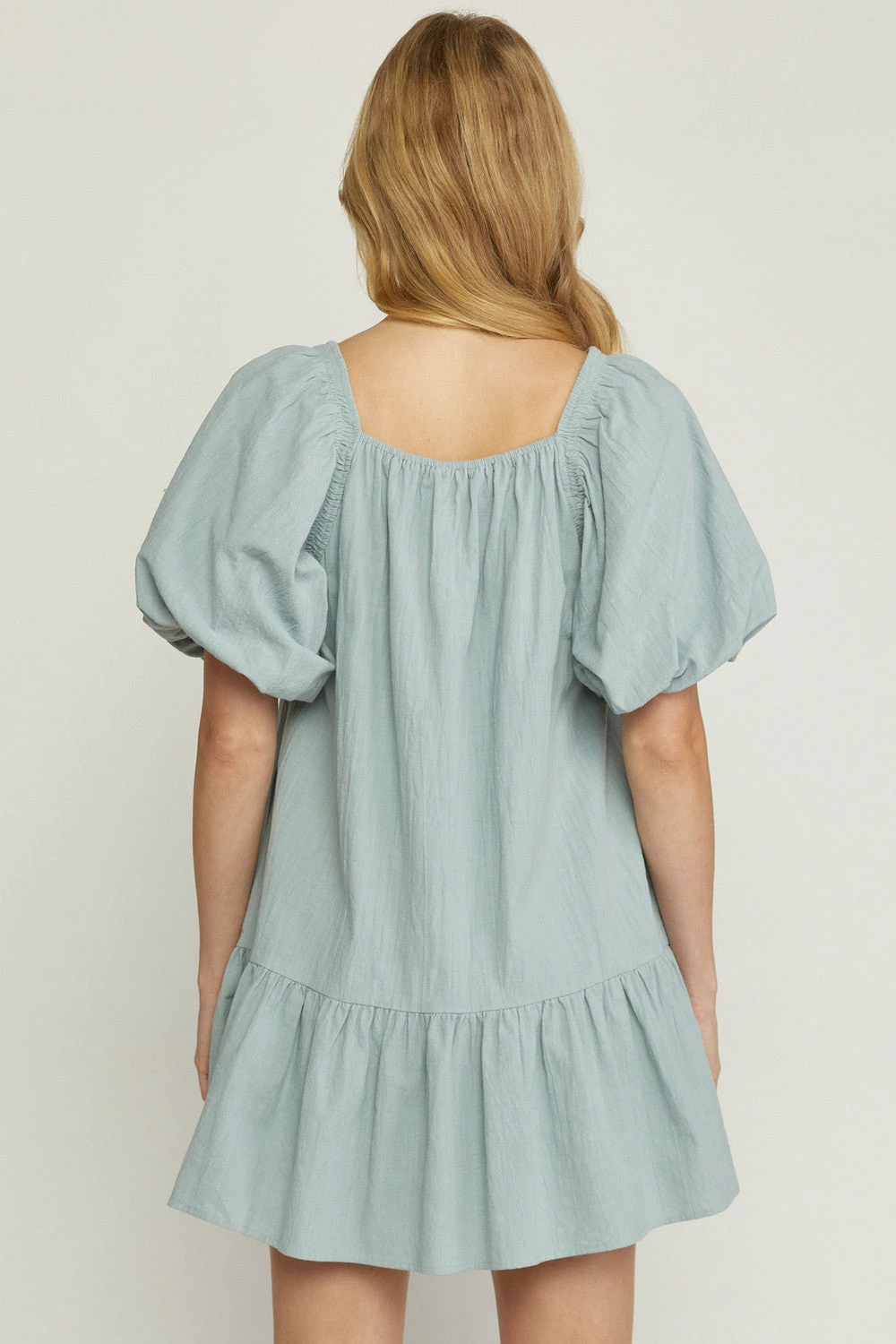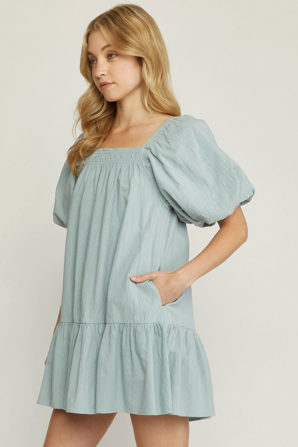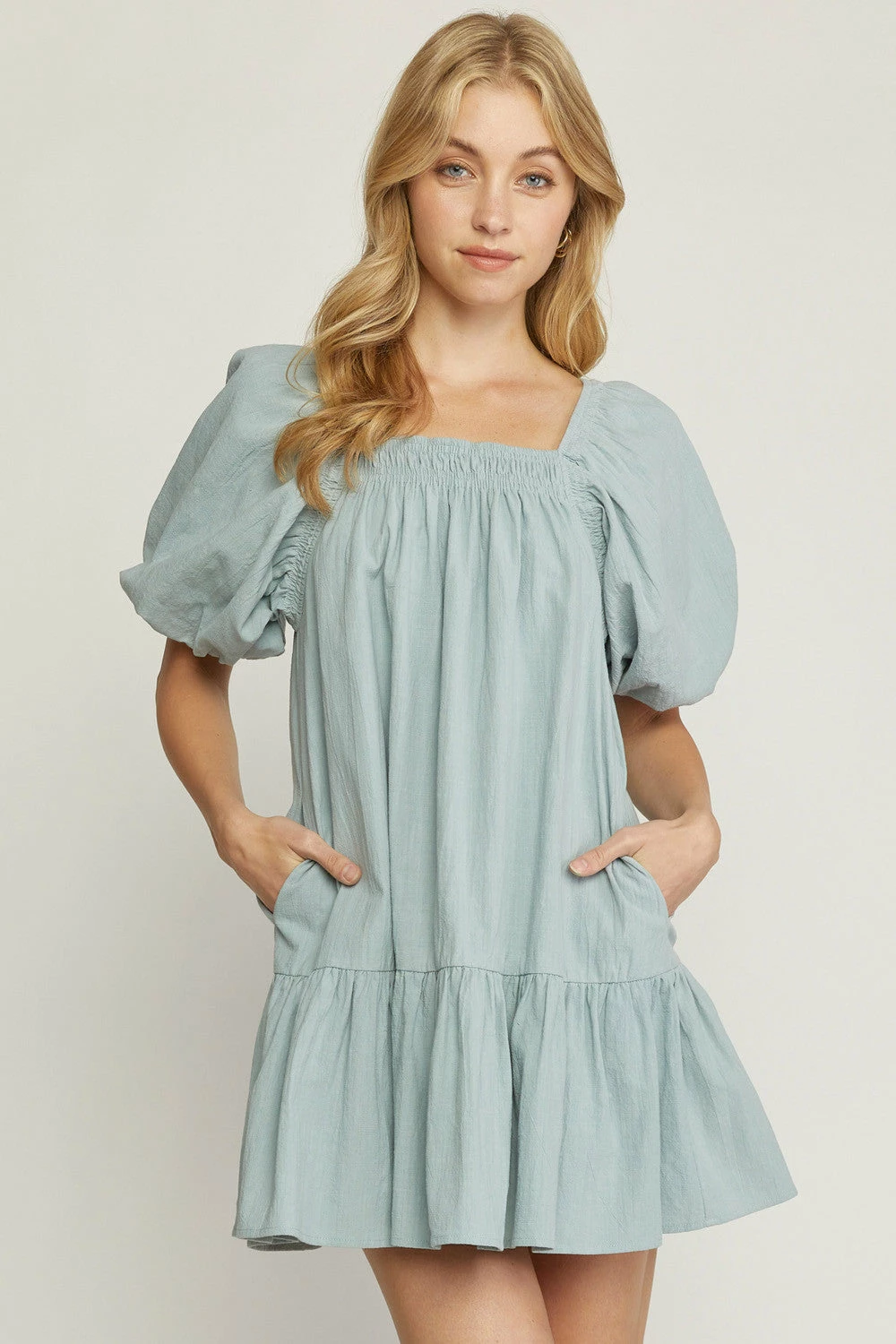 Solid square neck bubble sleeve tiered mini dress featuring ruching at neckline. Pockets at side. Lined. Woven. Non-sheer. Lightweight.