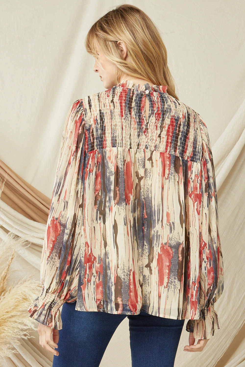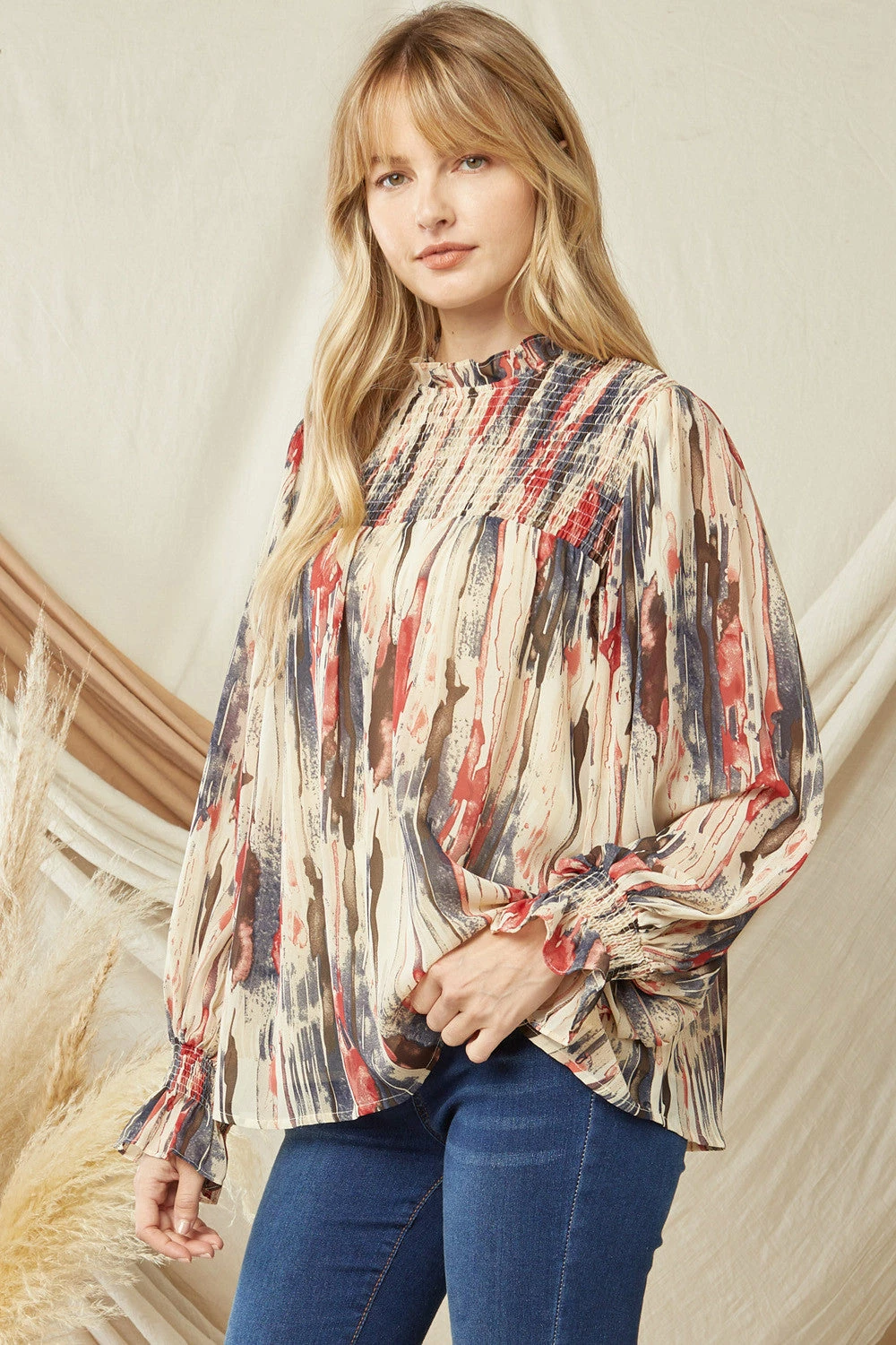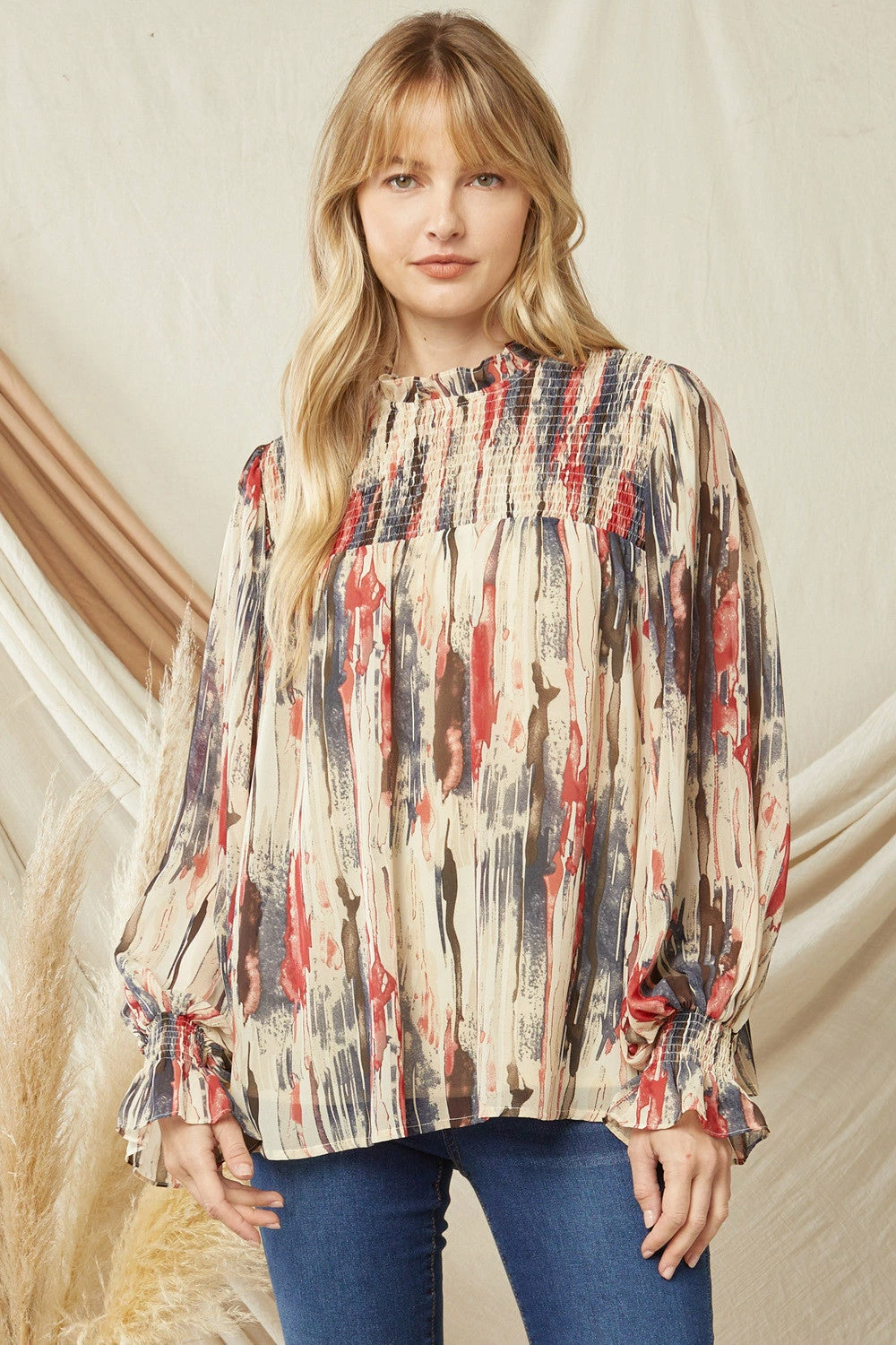 - Printed mock neck long sleeve top featuring smocking at chest and wrists. Keyhole button closure at back. Lined. Woven. Semi-sheer. Lightweight.