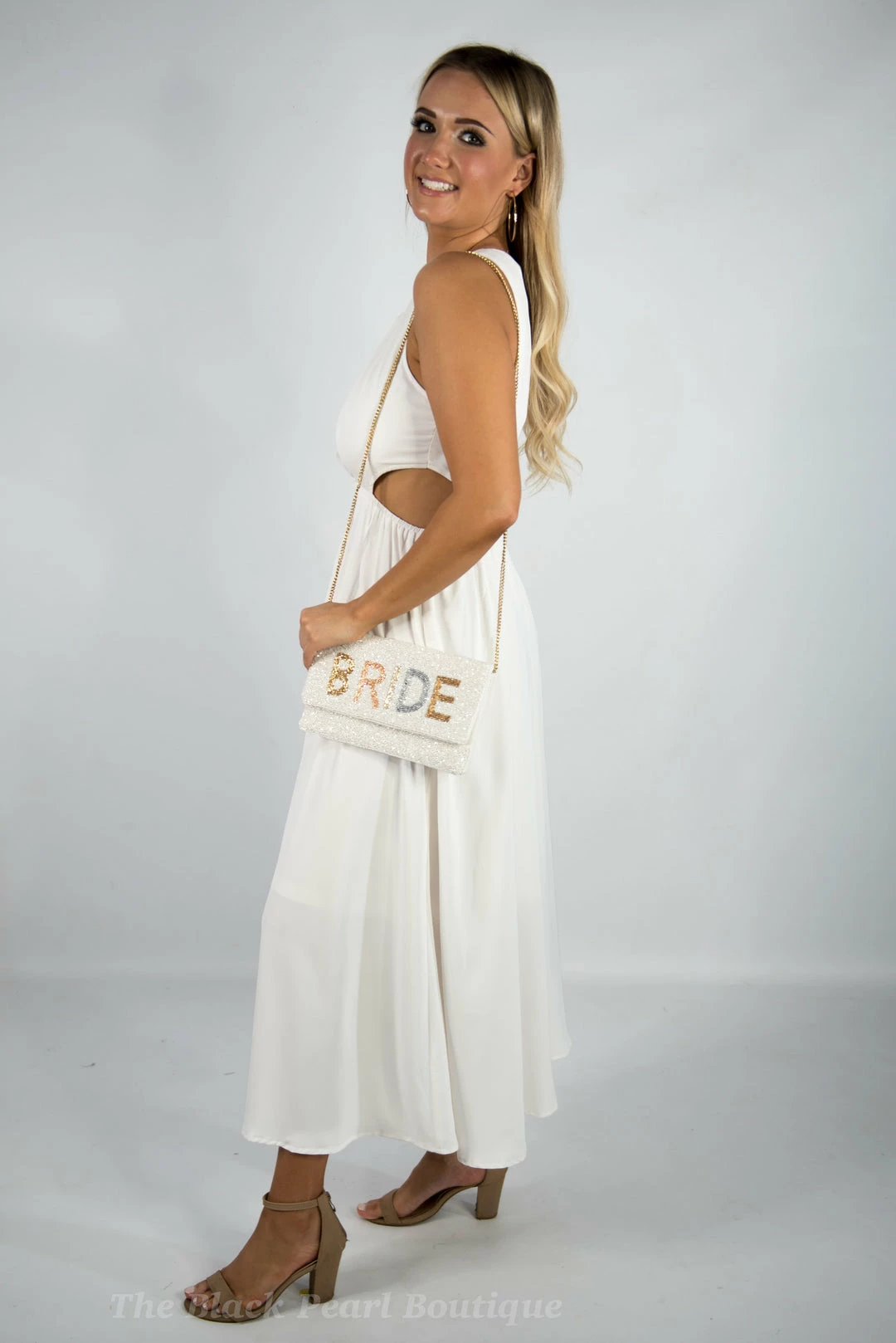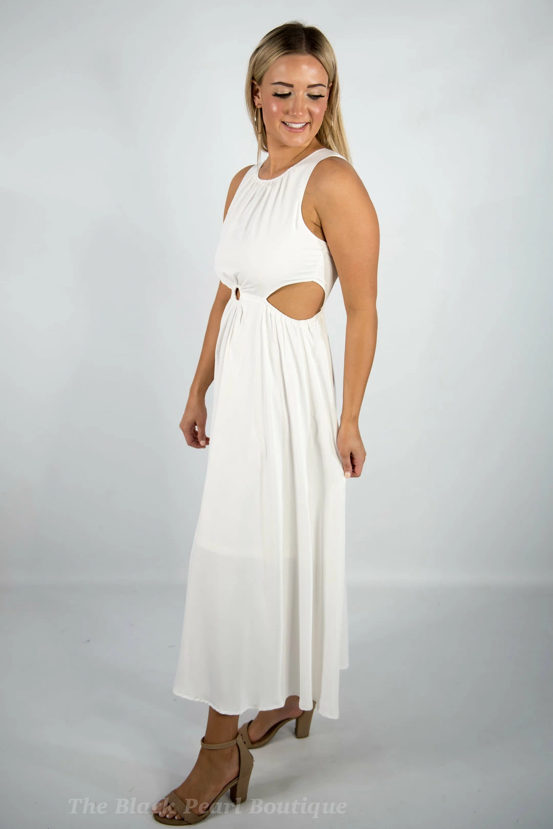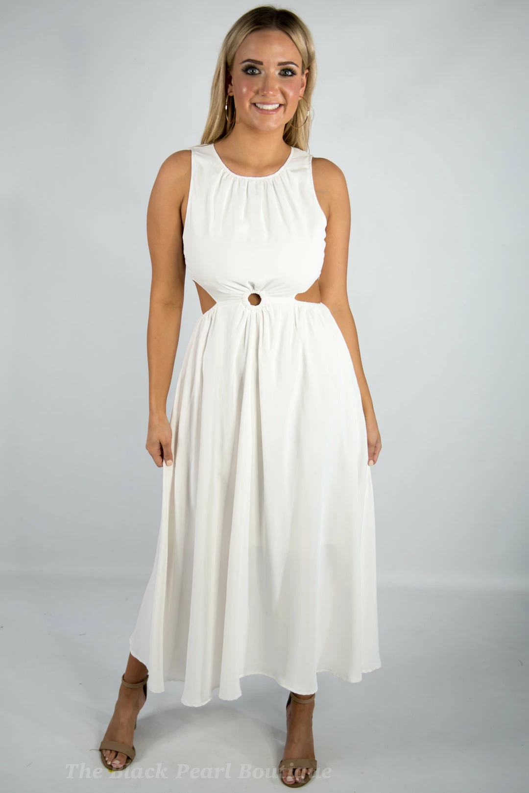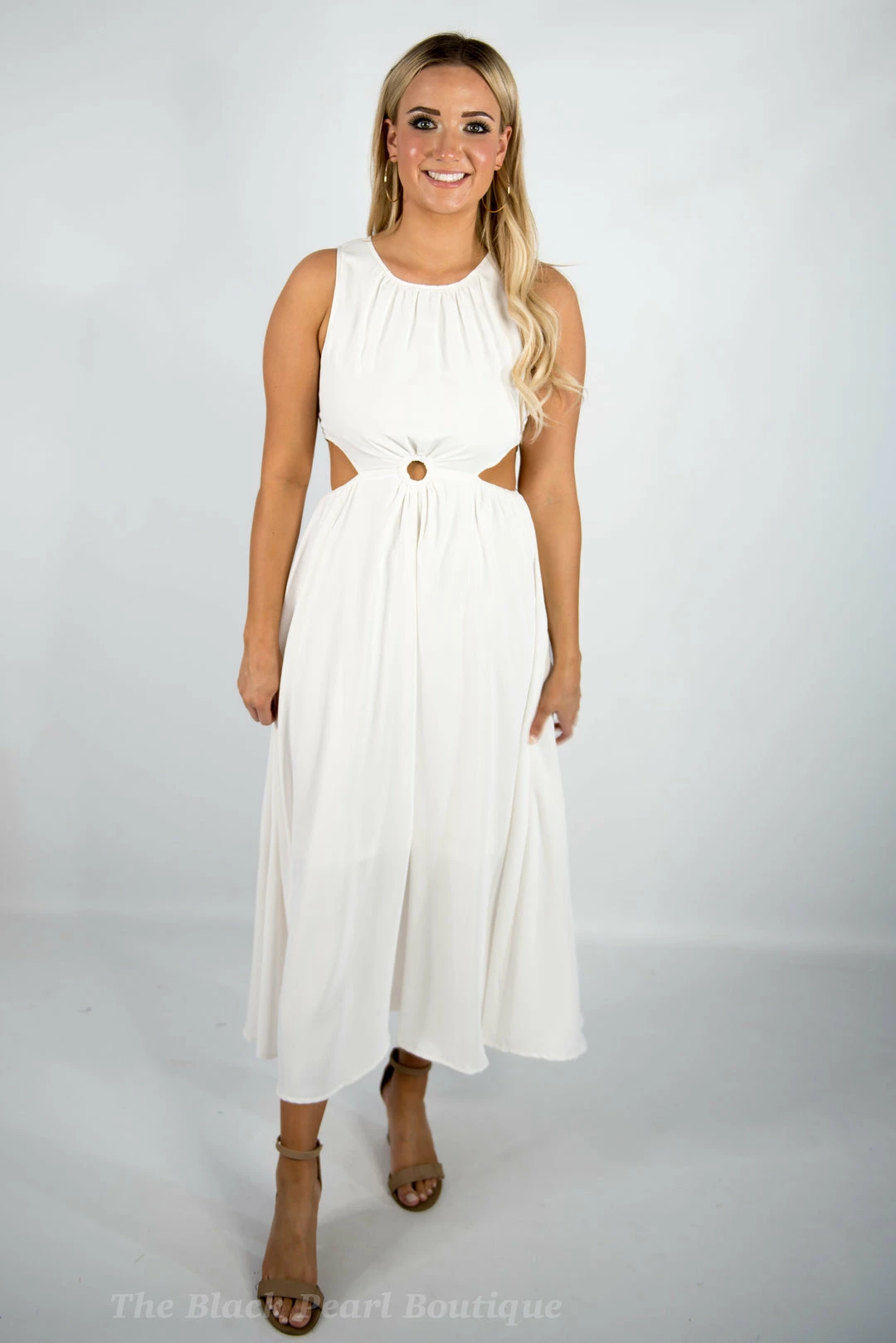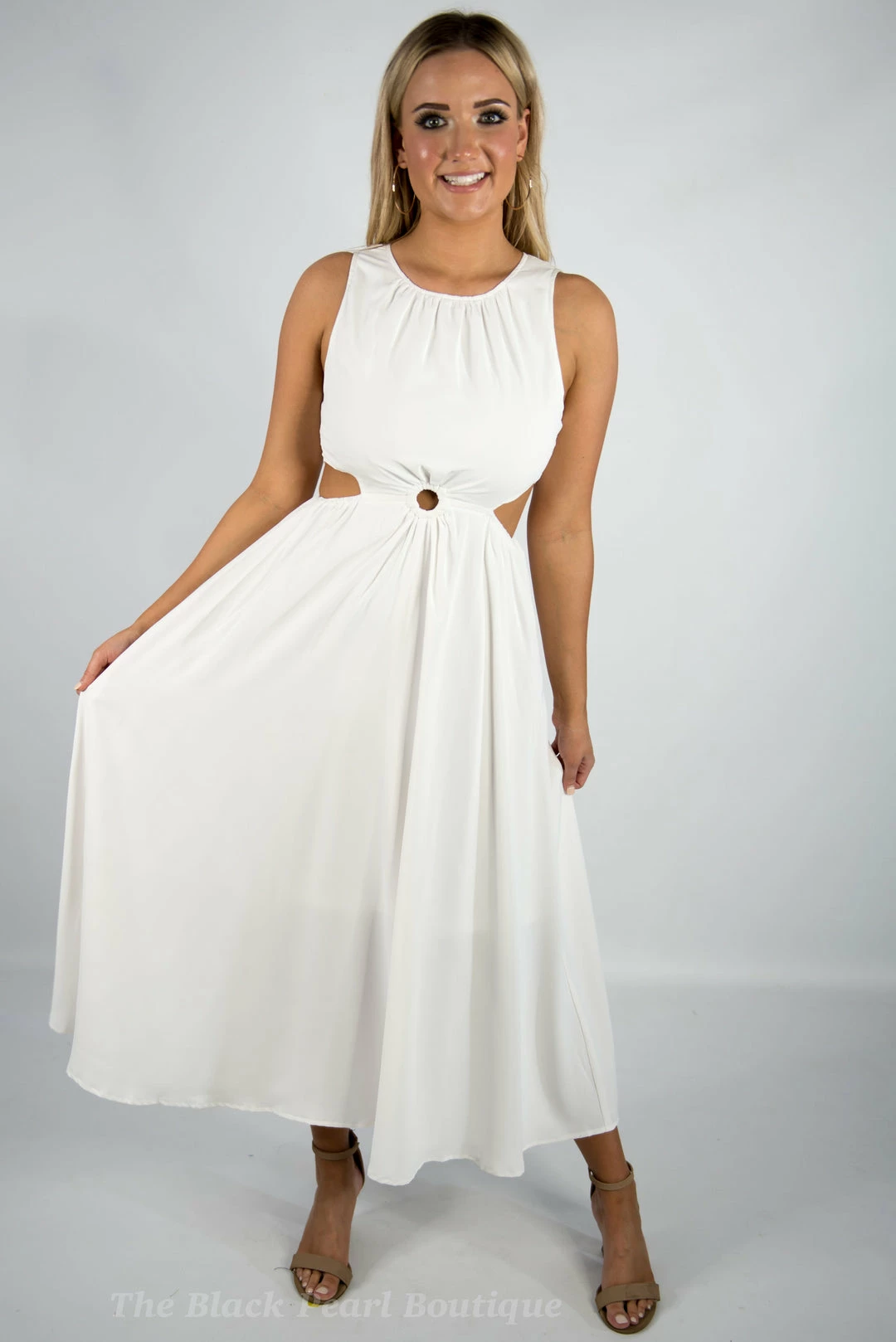 - Solid round neck sleeveless midi dress featuring cut outs at sides with O ring detail at the center. Zip closure at back. Lined. Woven. Non-sheer. Lightweight.