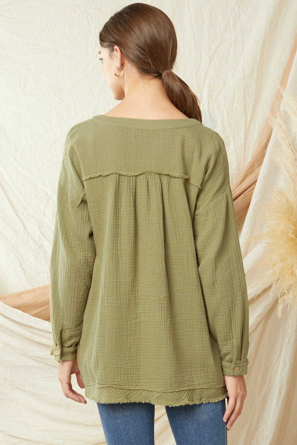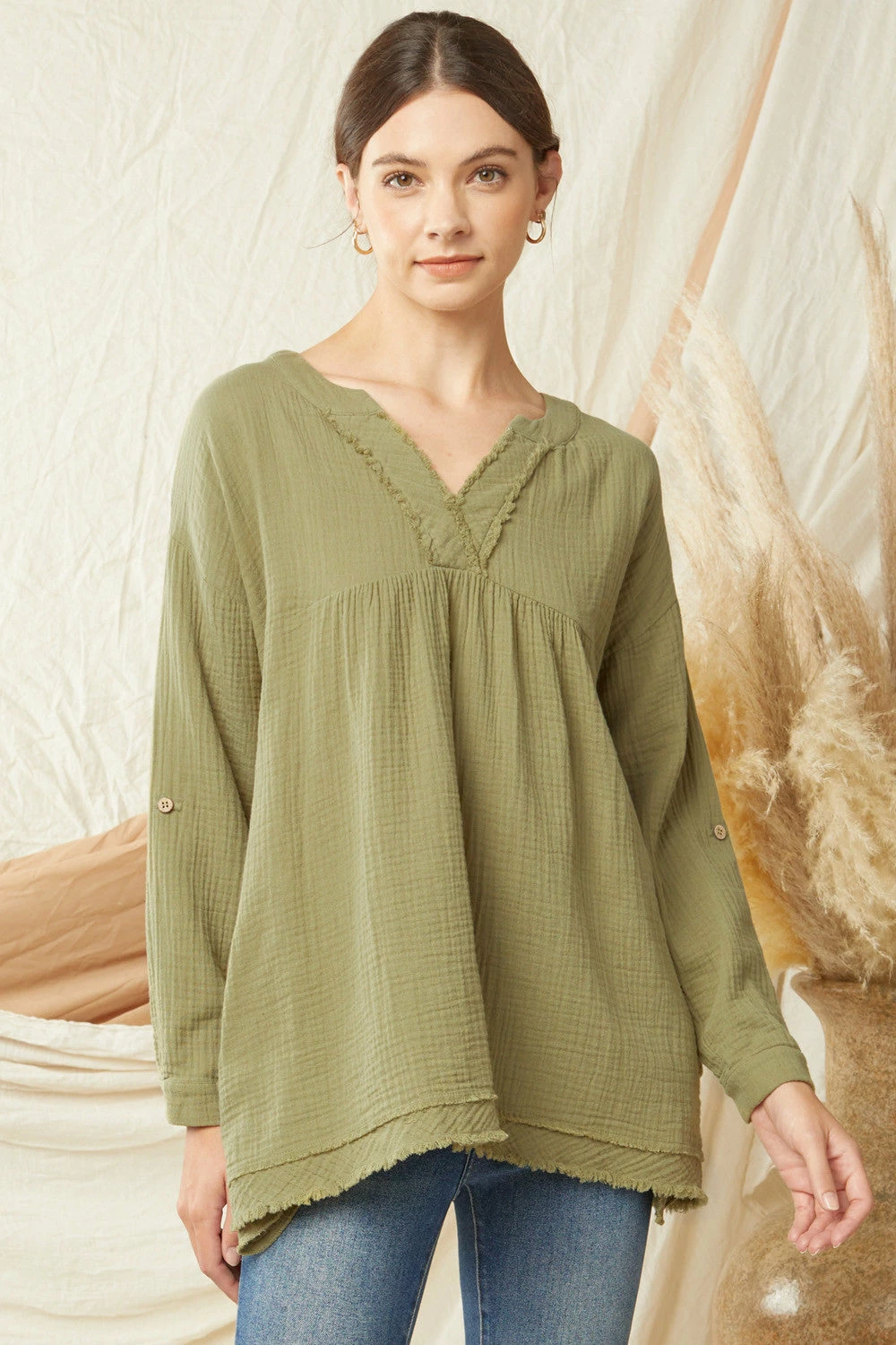 - Solid textured v-neck long sleeve top featuring adjustable sleeve length with button closure at elbow. Button closure at wrist. Freyed hem. Unlined. Woven. Non-sheer. Lightweight.