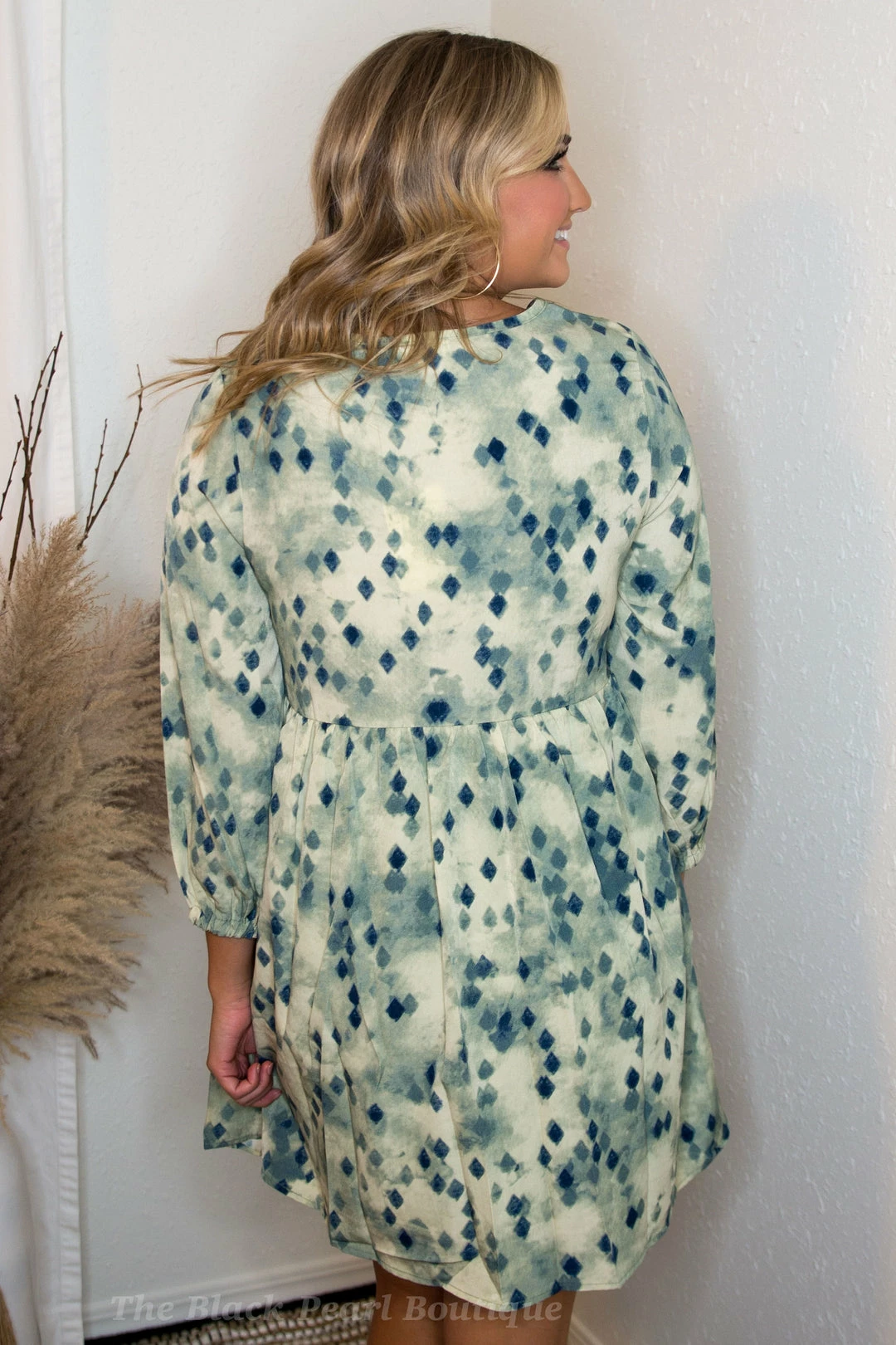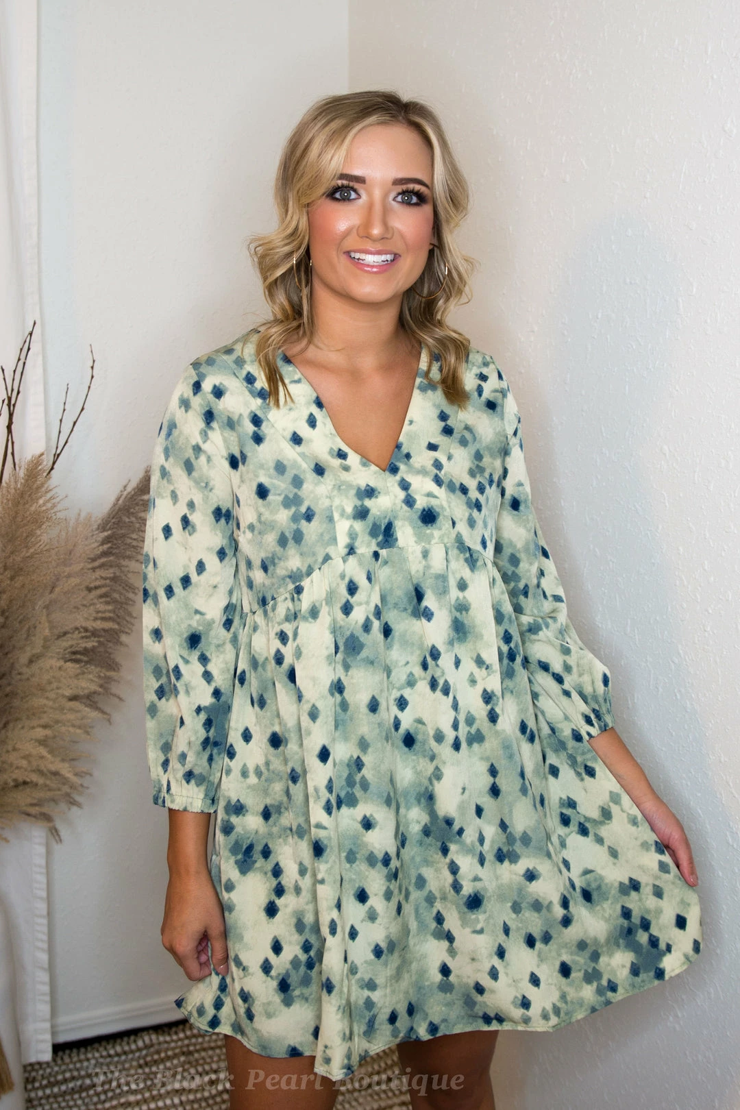 - Printed v-neck 3/4 sleeve length dress featuring tiering detail. Lined. Woven. Non-sheer. Lightweight.