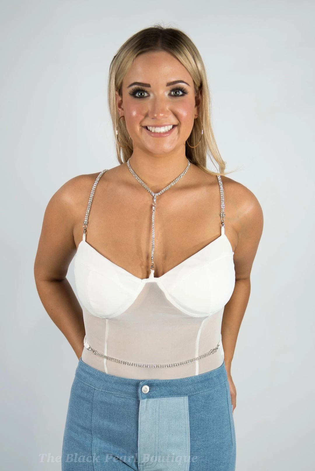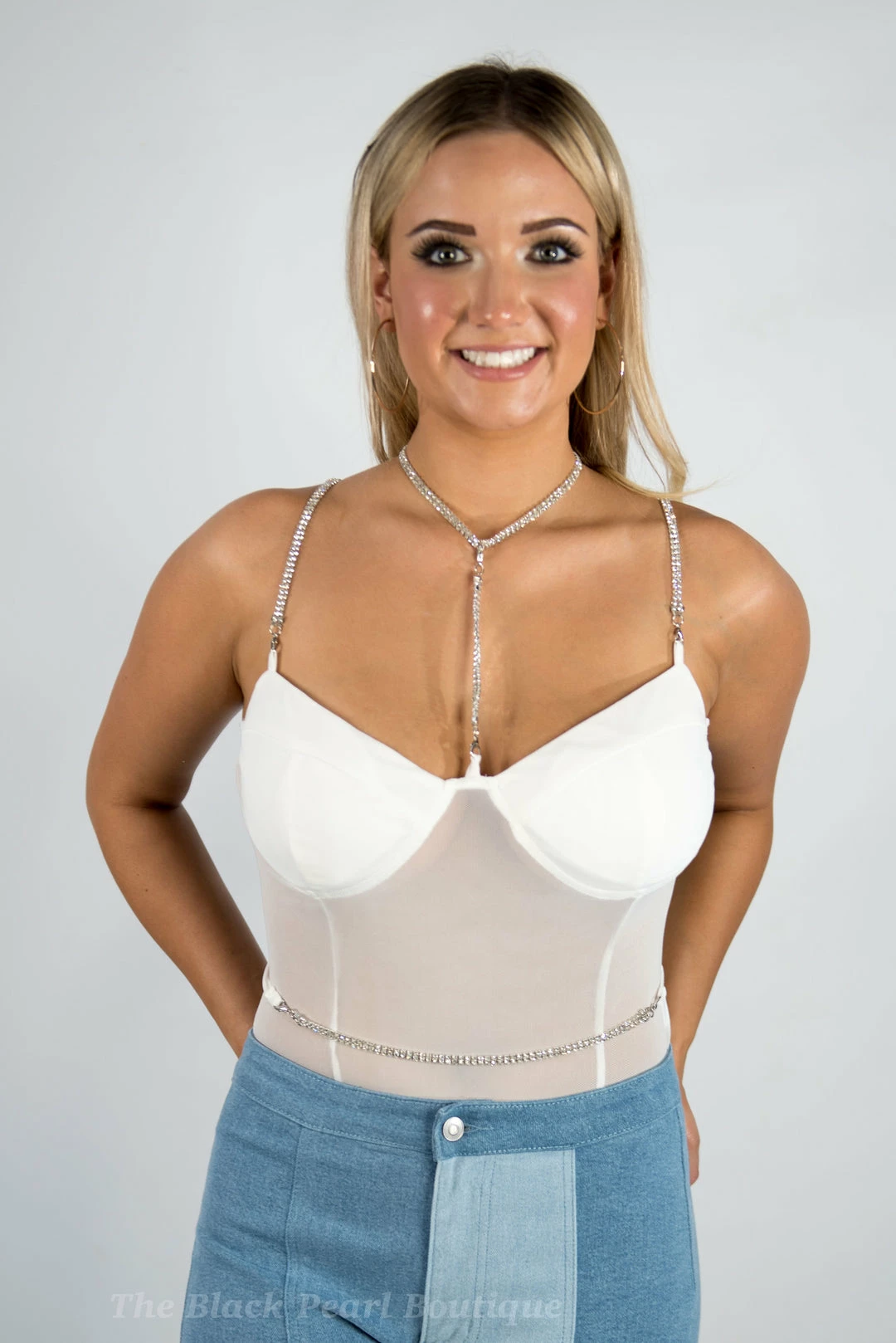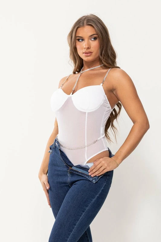 - RHINESTONE CHOKER AND BELT MESH BODYSUIT - BUTTON CLOSURE ON BOTTOM