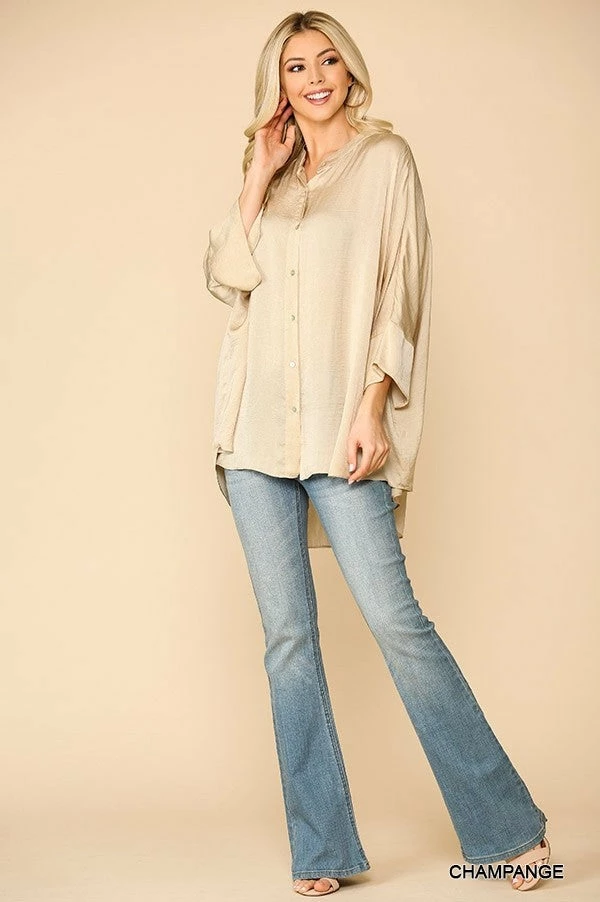 - Washed Satin Button Down Loose Fit Top with Hi-Lo Hem. Light weight