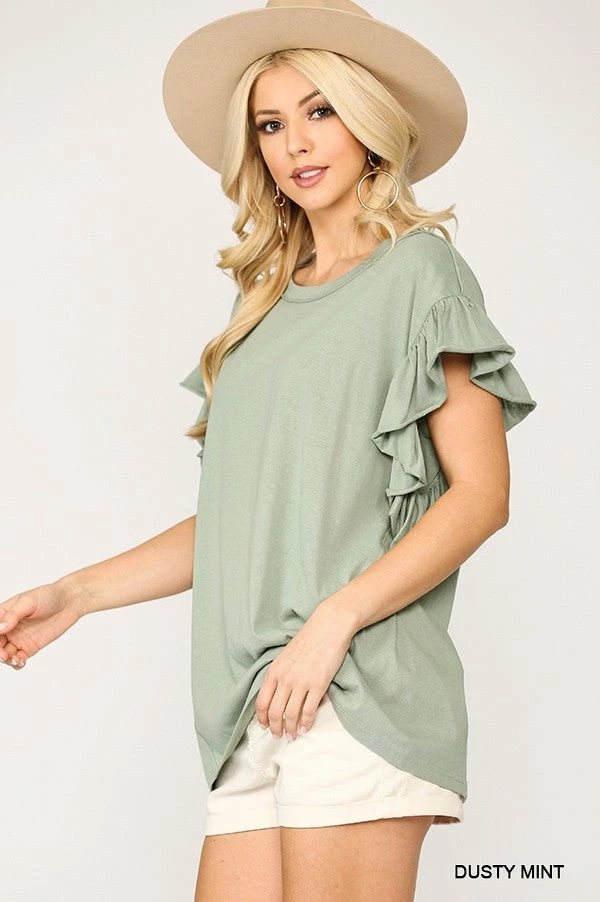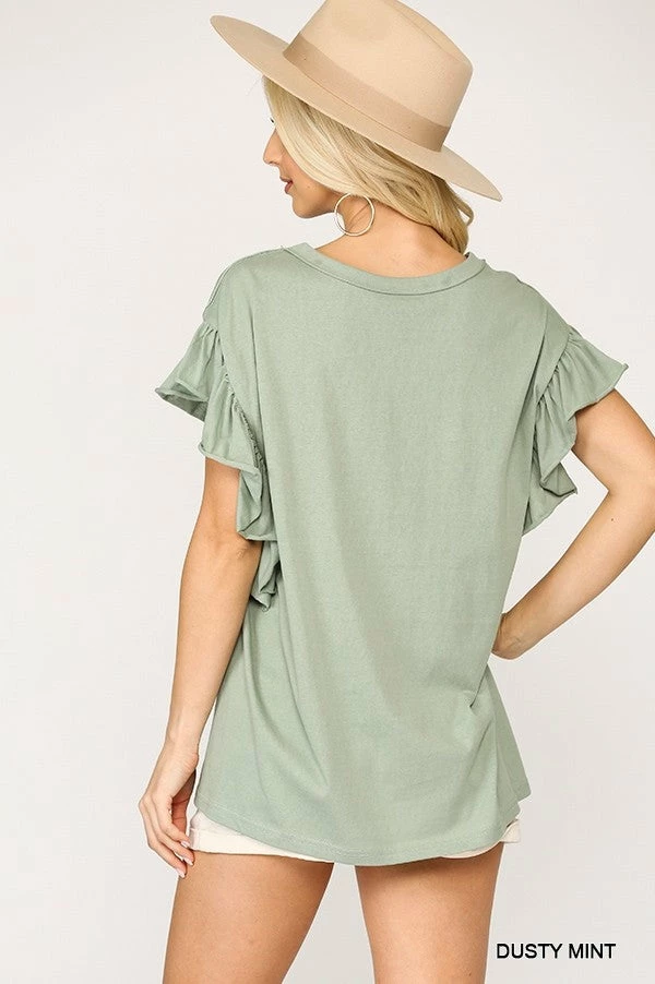 Solid Slub Cotton Knit Shoulder Flutter Sleeve Top