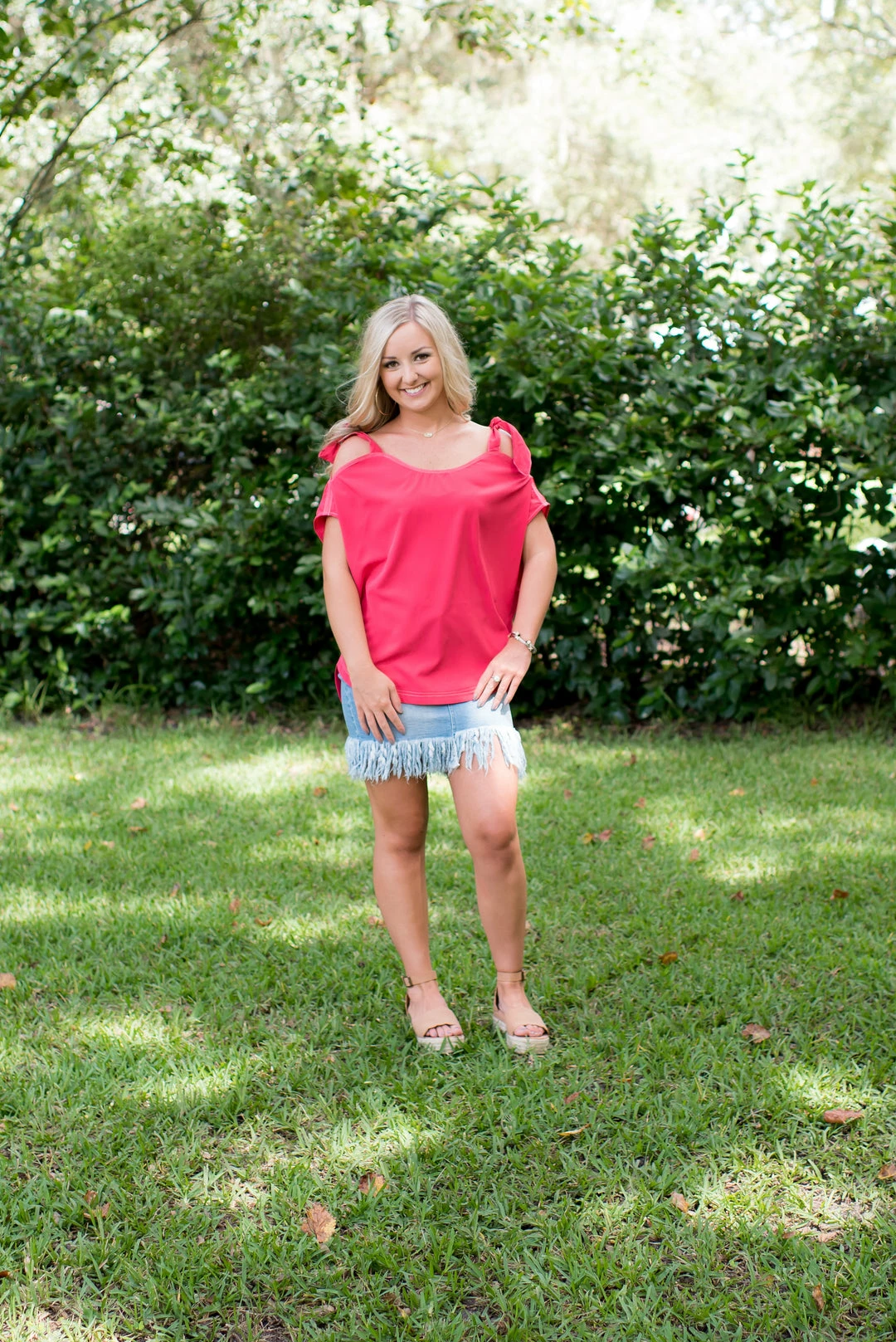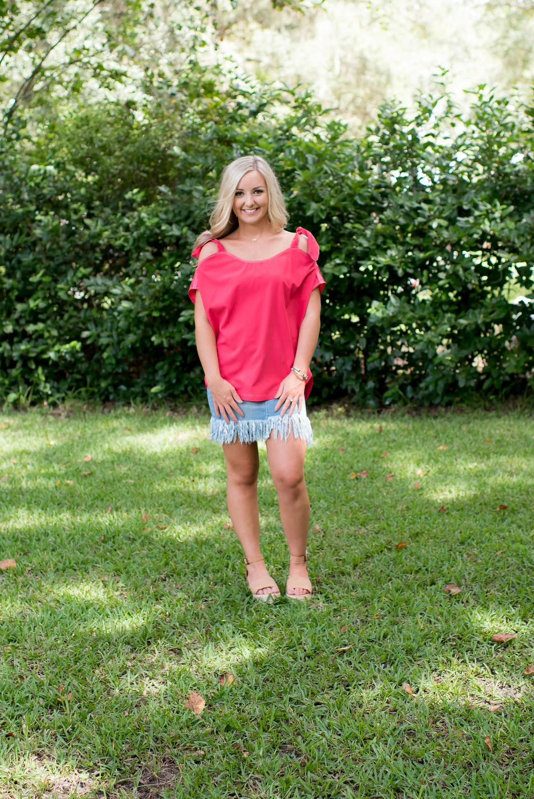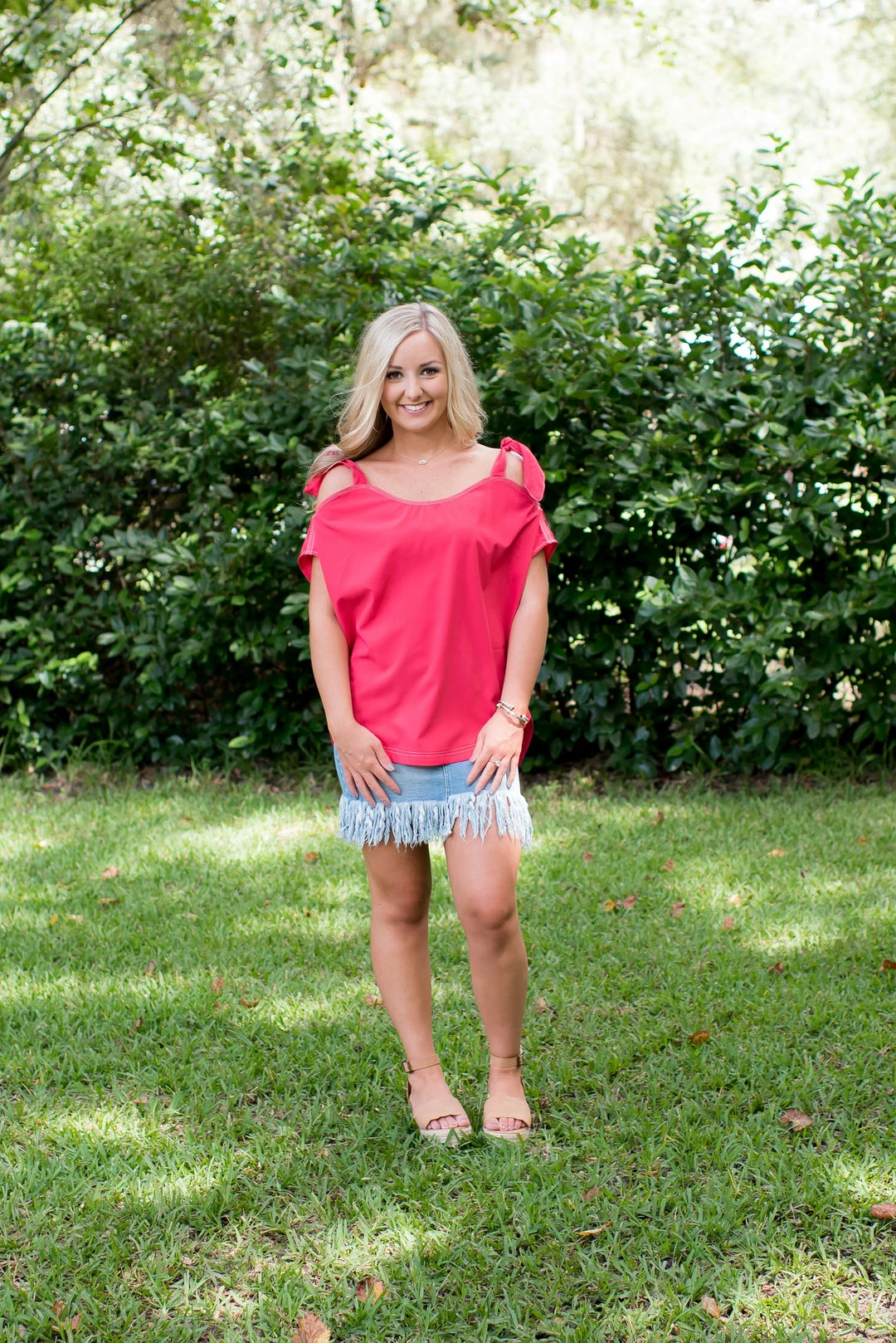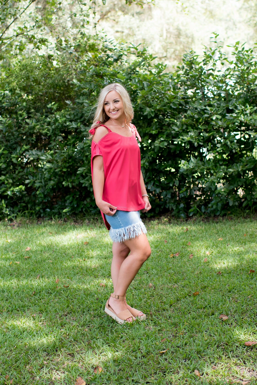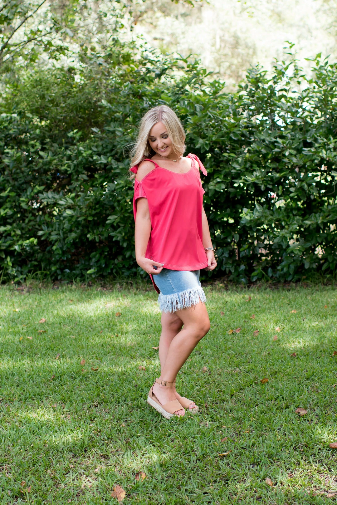 - This top is so adorable and perfect for your wardrobe! Ties around shoulder, can be tie into a knot or a bow! Pairs so well with our denim bottoms!