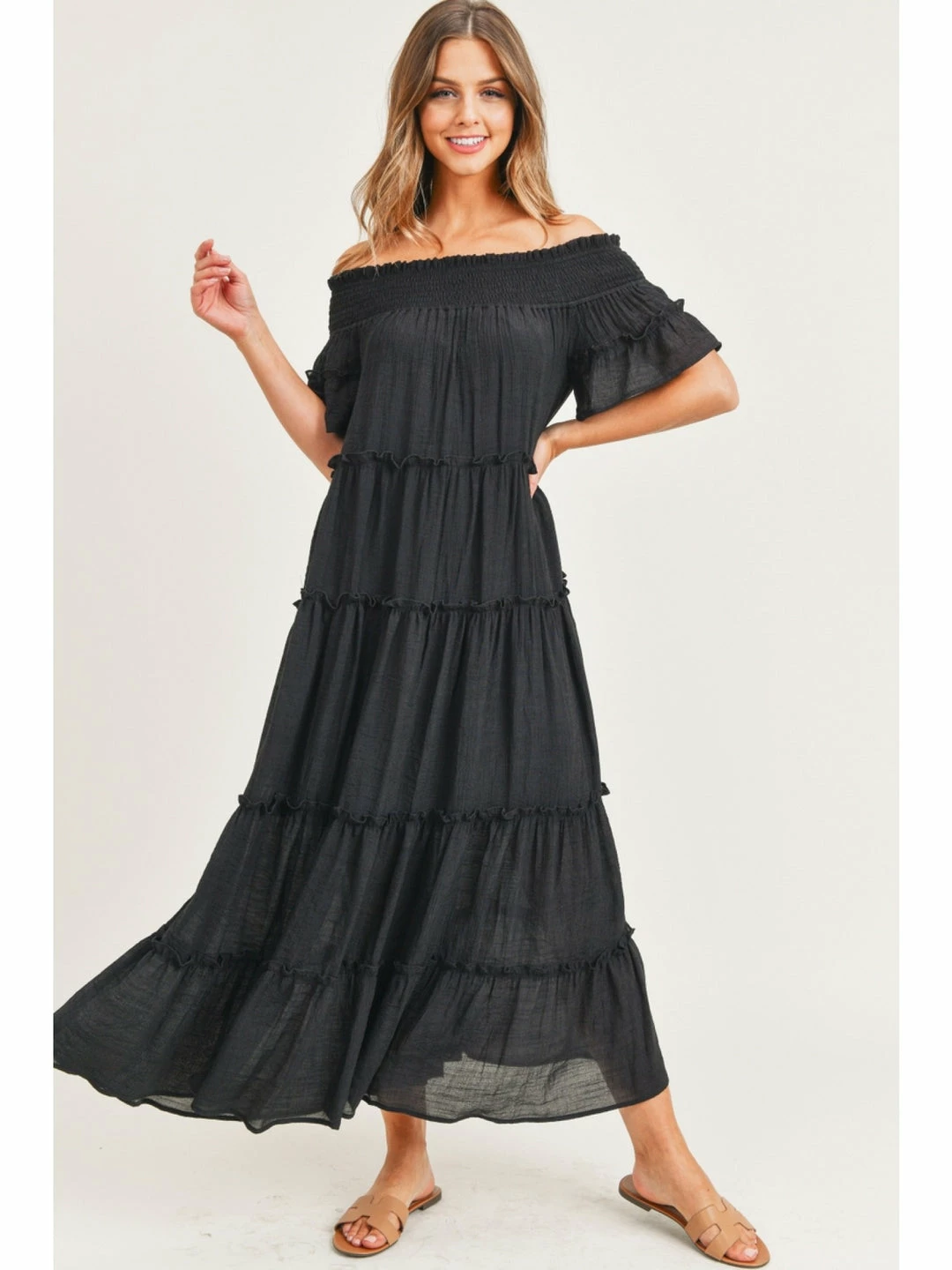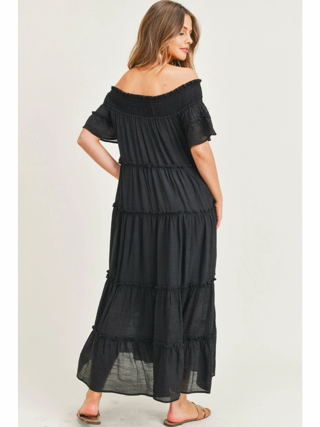 - Solid maxi dress with an elasticized off shoulder neckline, short bell sleeves, and tiered layers.