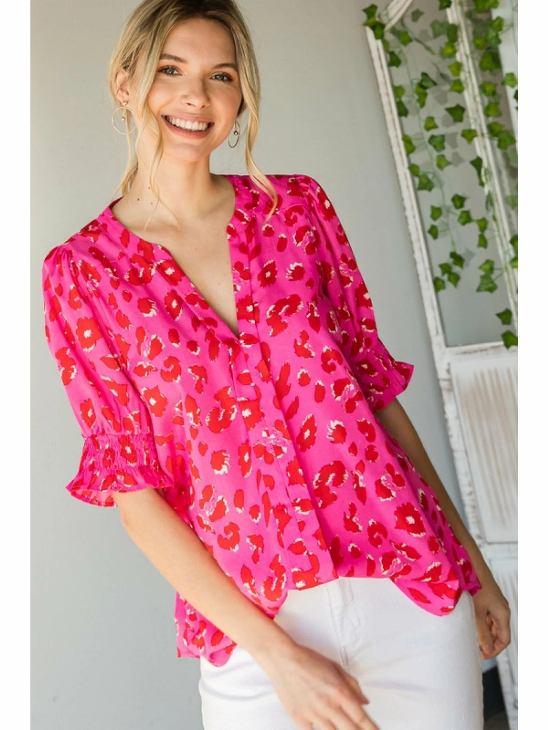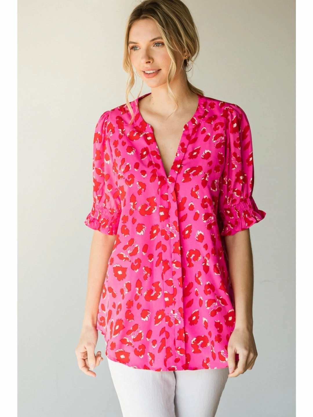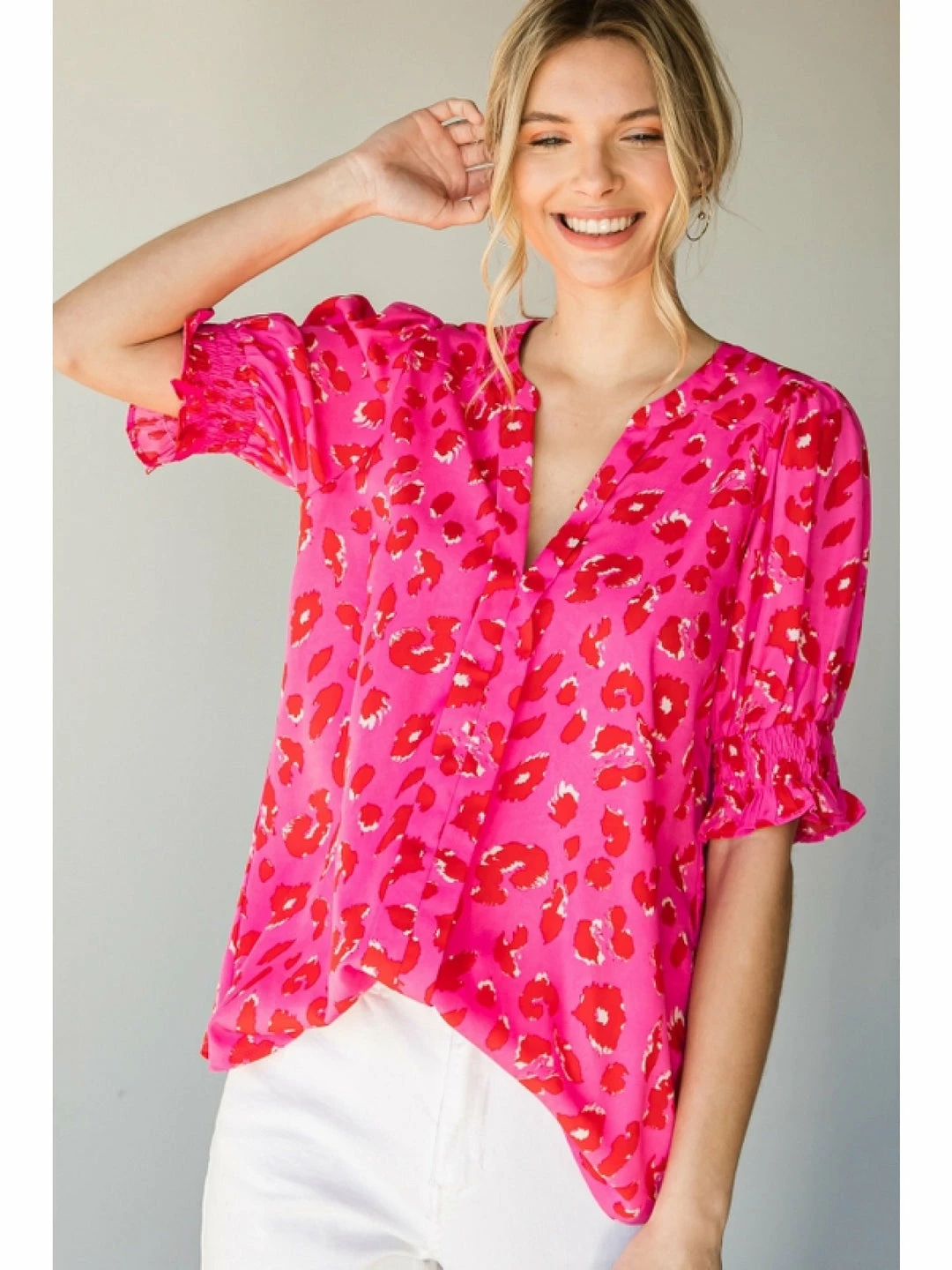 Leopard print top with a V-neckline and short bubble sleeves with smocked cuffs.