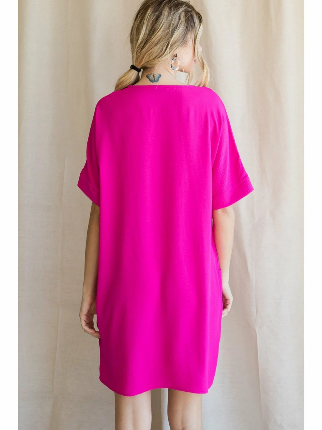 - Solid boxy dress with a wide V-neckline, short sleeves, and front pockets.