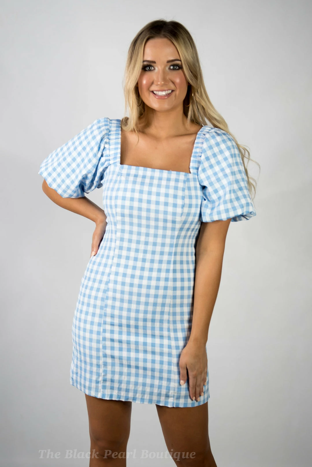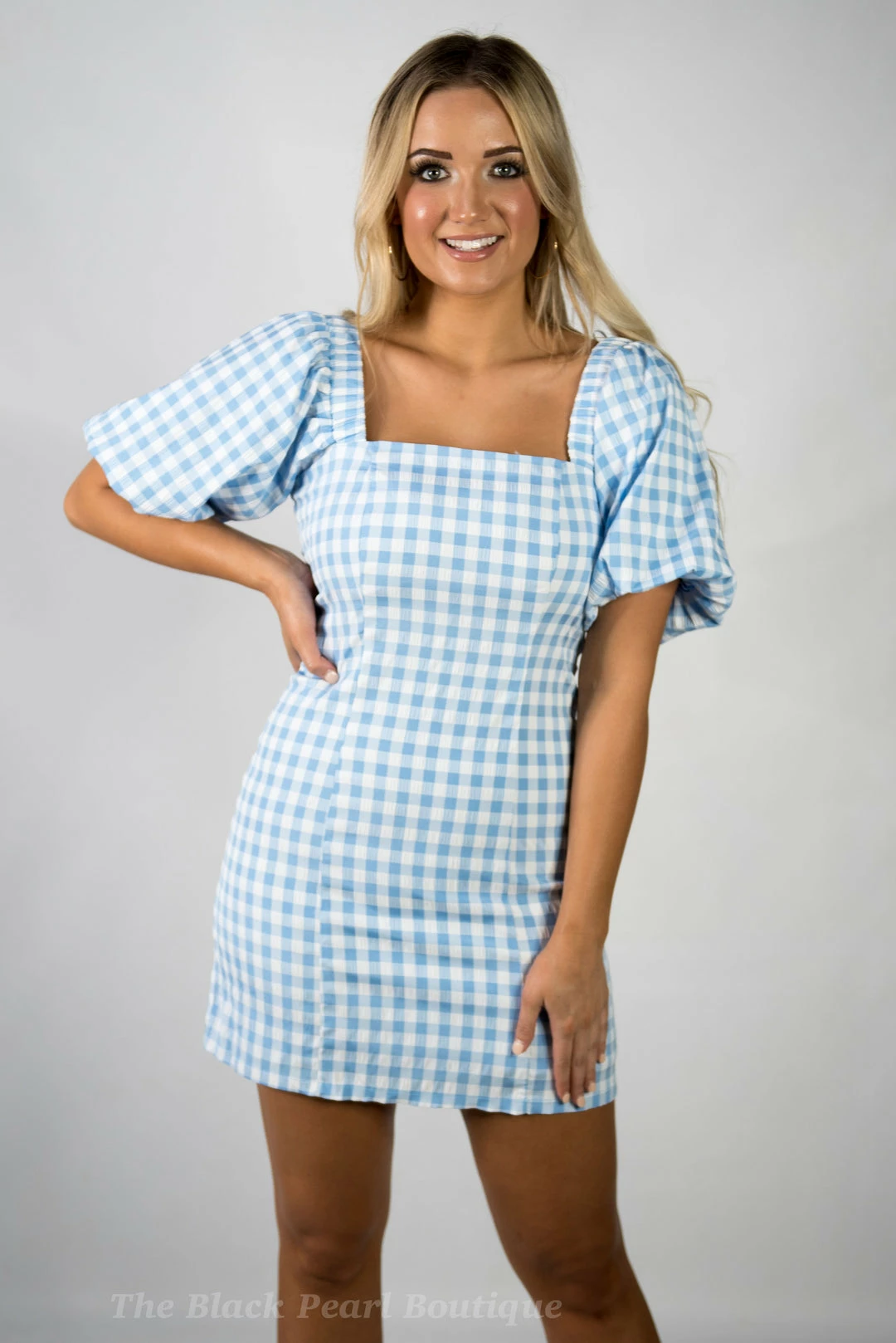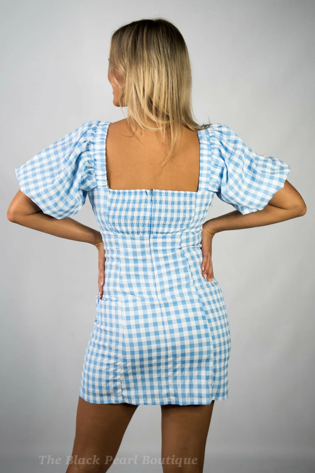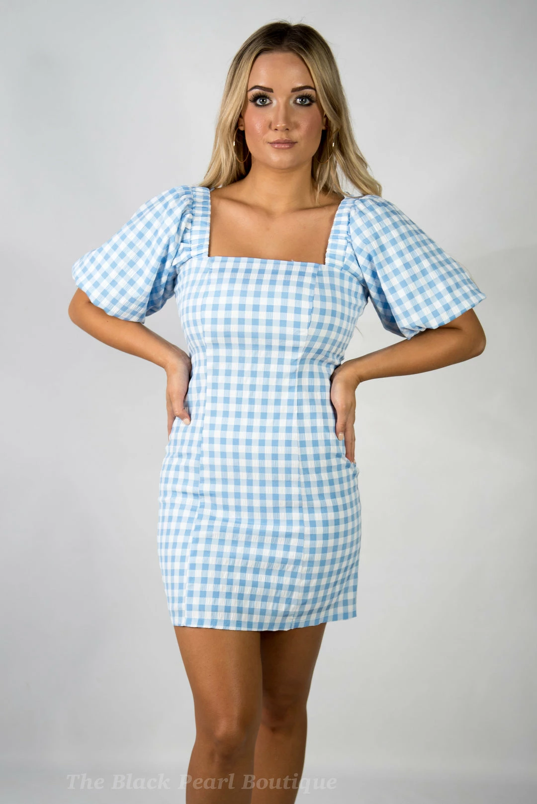 Lena Blue/White Tartan Balloon Sleeve Dress New Arrivals