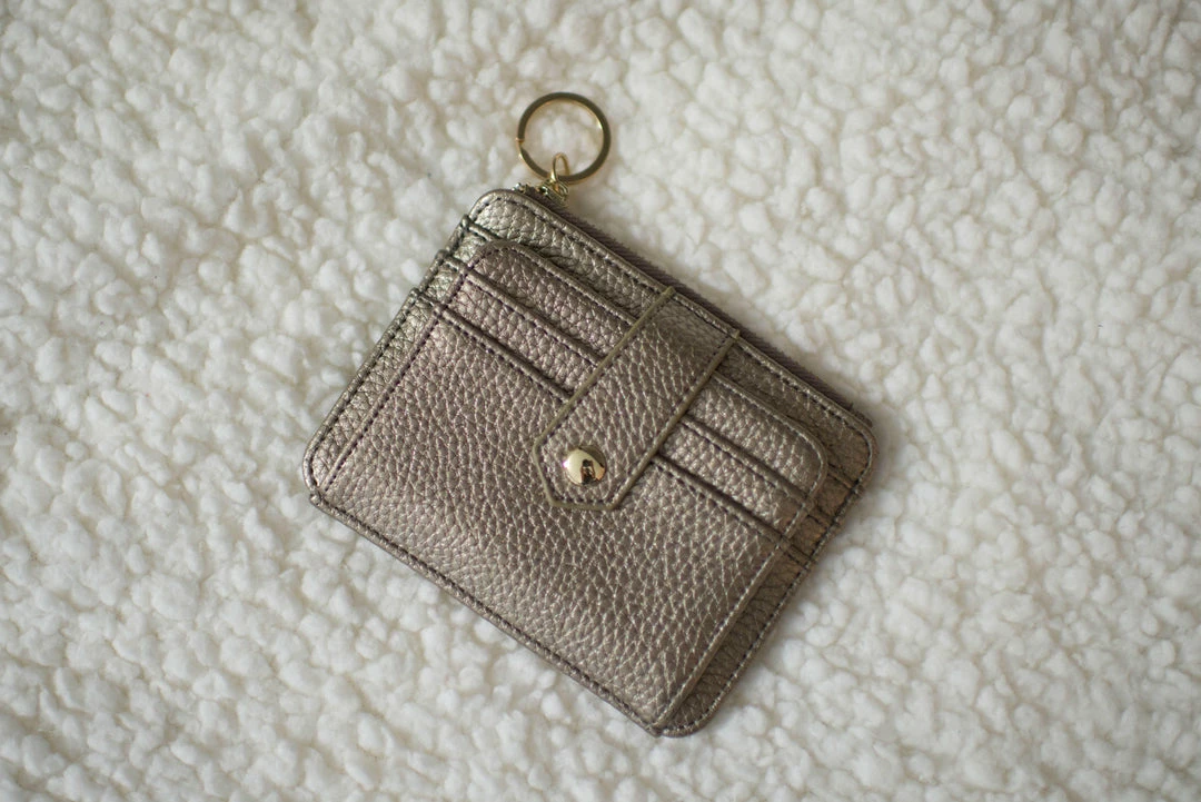 - Looking for that perfect wallet that holds your credit cards and money. This wallet has a snap closure and zipper compartment on the other side. Gold glam is a gold wallet with a rich gold zipper and key ring. The wallet makes the perfect accessory for the crossbody.Â