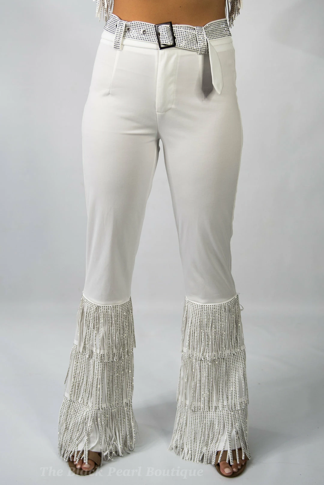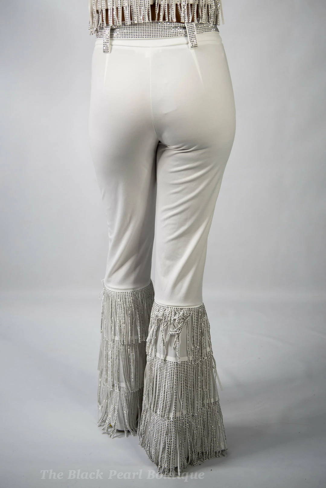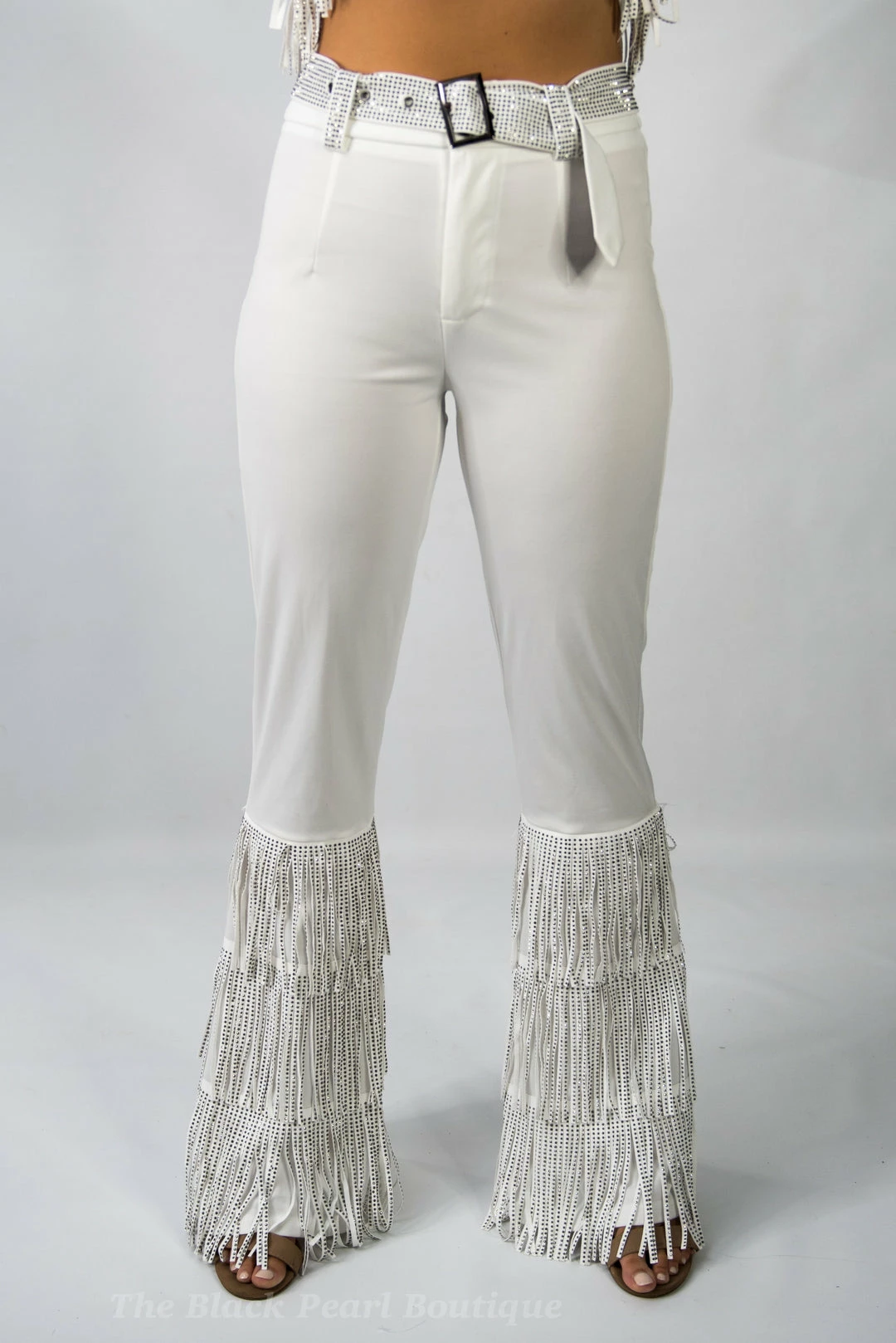 Suede fabric high waist with sequins belt women pants. Fringed legs, fashion pants.