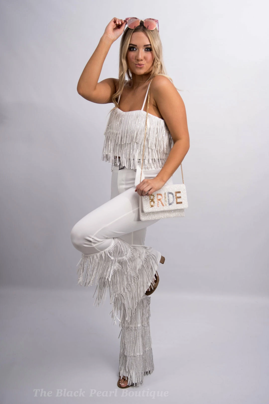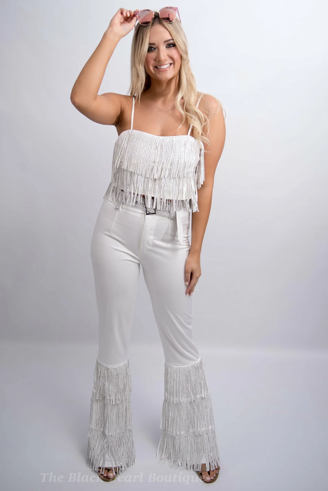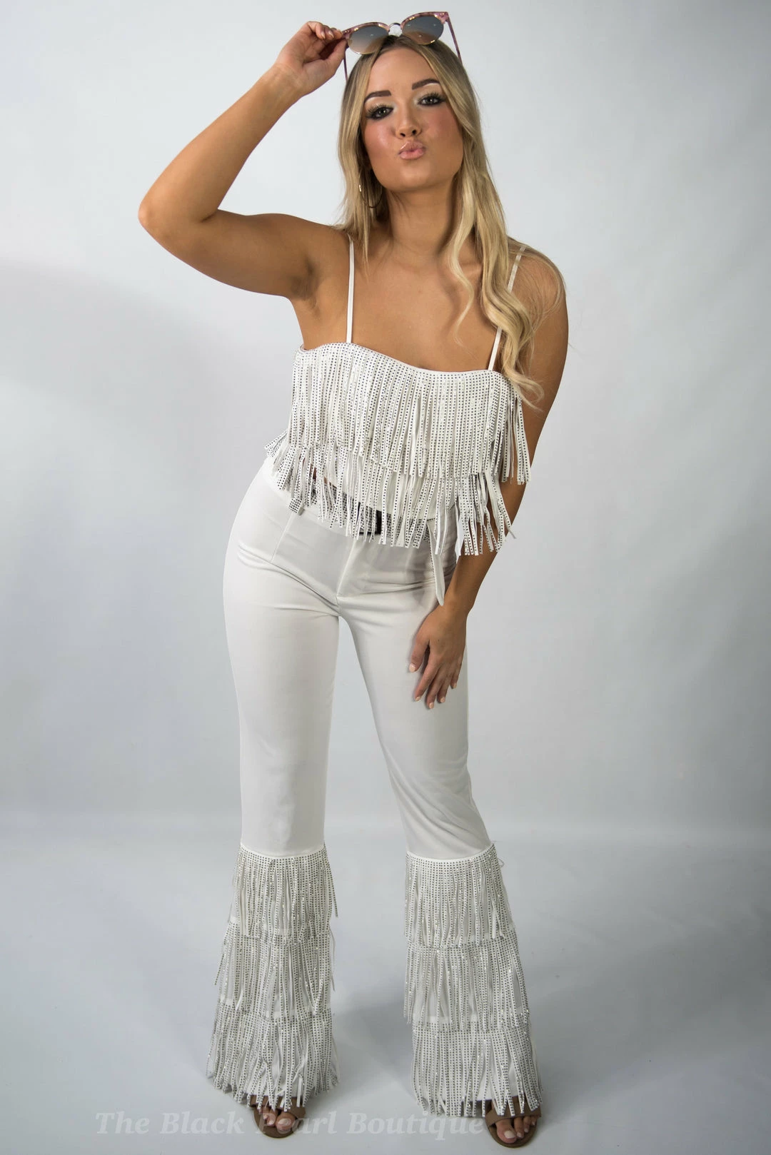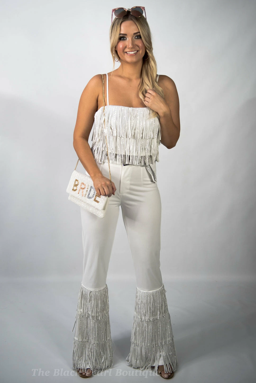 Suede fabric high waist with sequins belt women pants. Fringed legs, fashion pants.