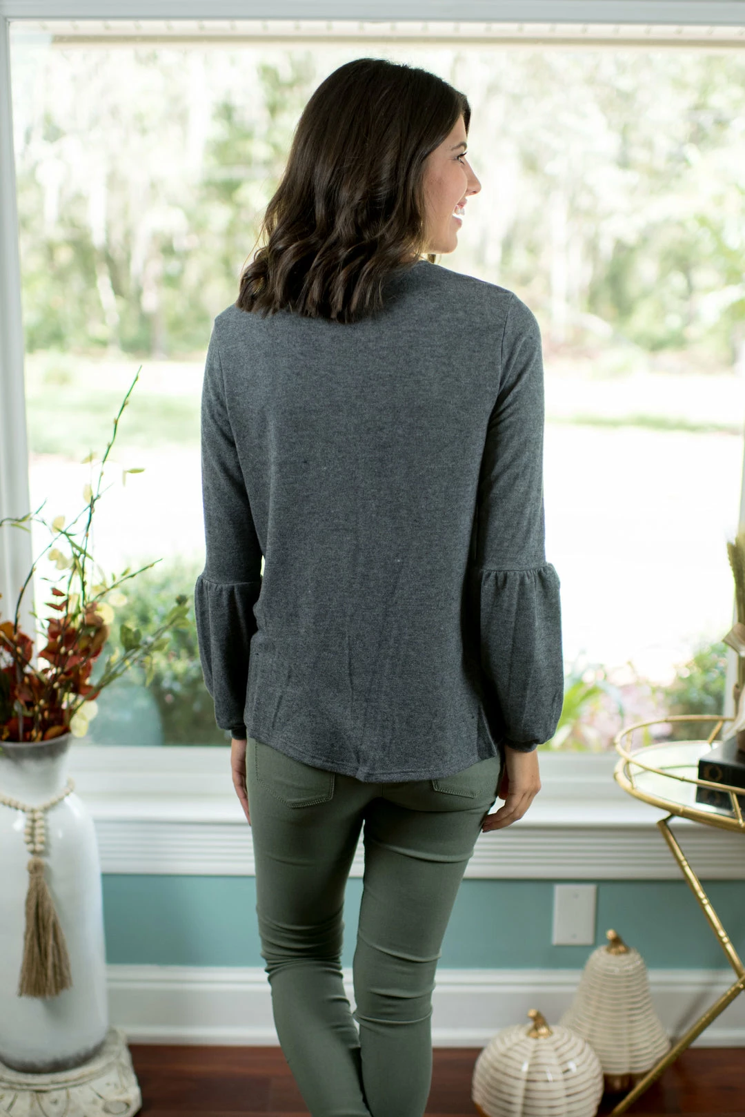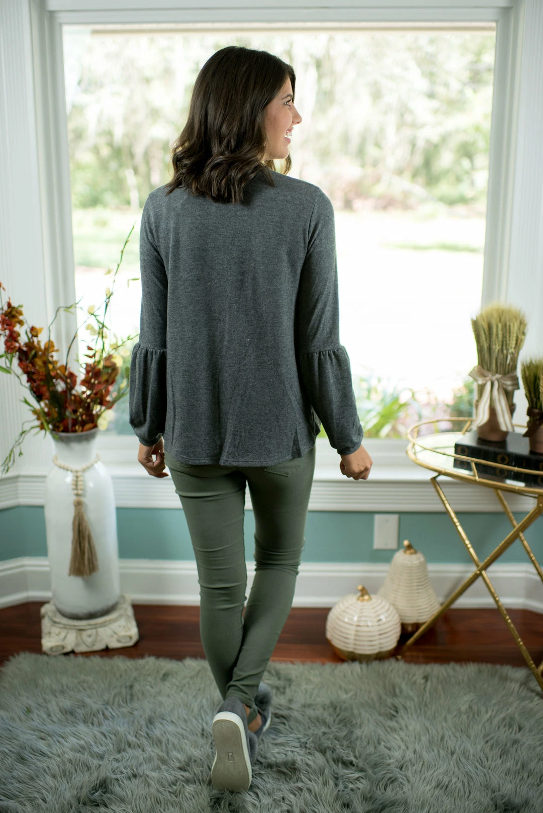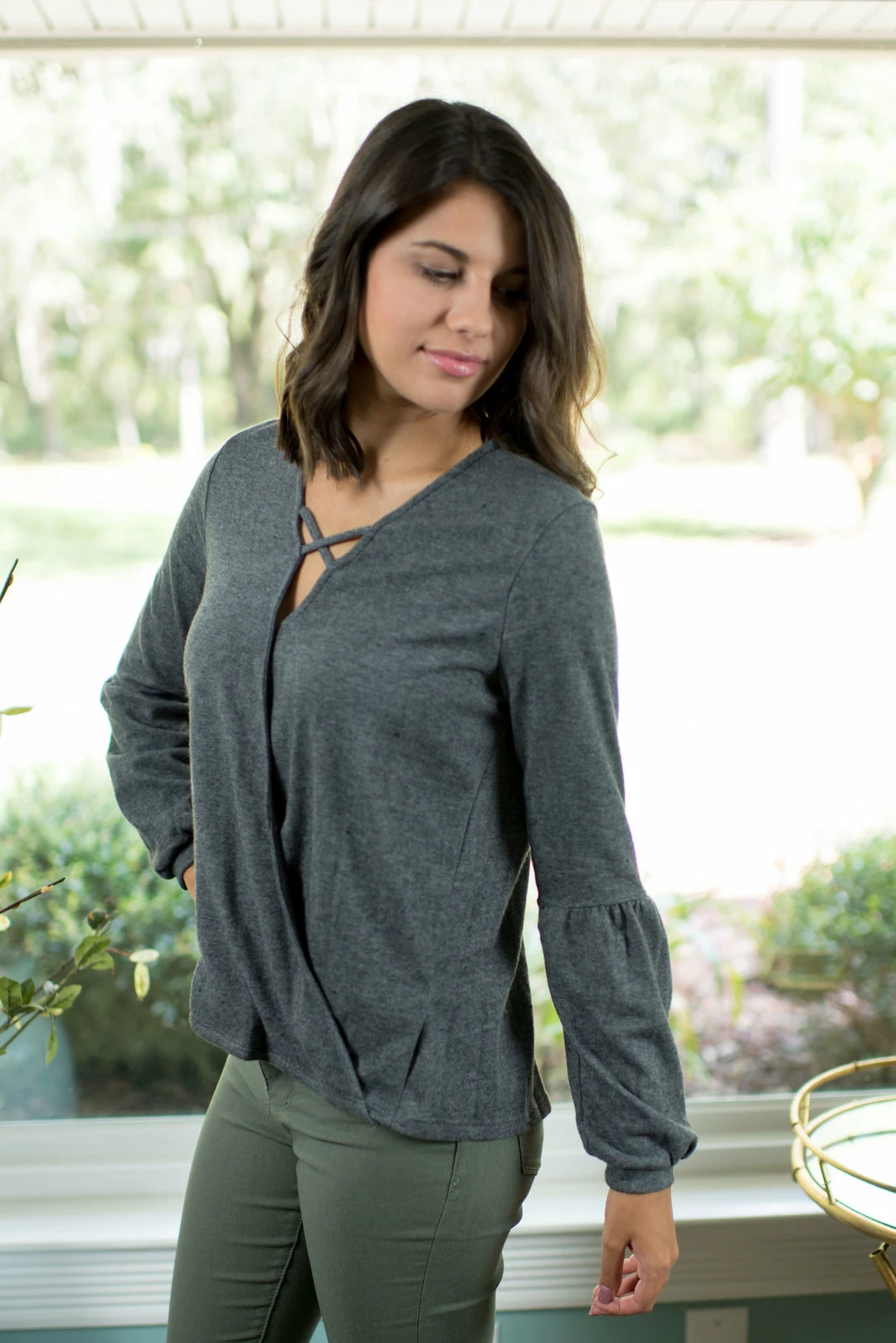 - Our criss cross charcoal top is absolutely adorable and pairs so well with our olive hyper stretch pants and grey pom pom shoes!