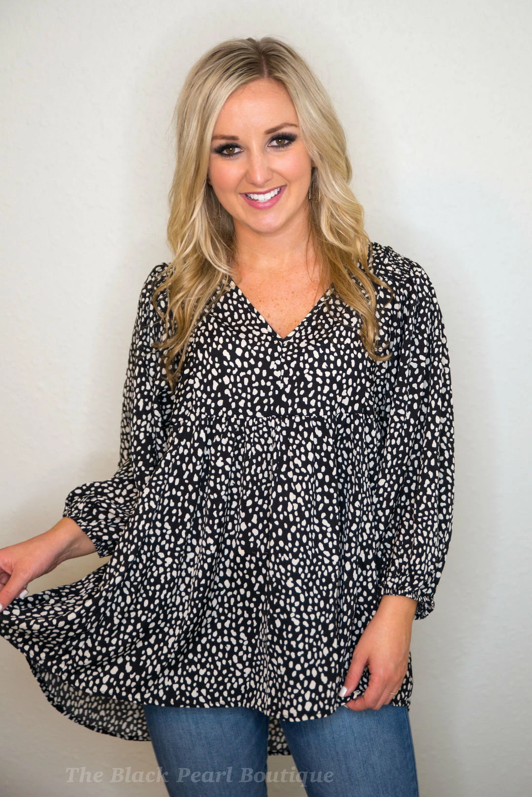 - Animal Print V-Neck 3/4 Sleeve Smocked Detail Babydoll Top with High Low Hem