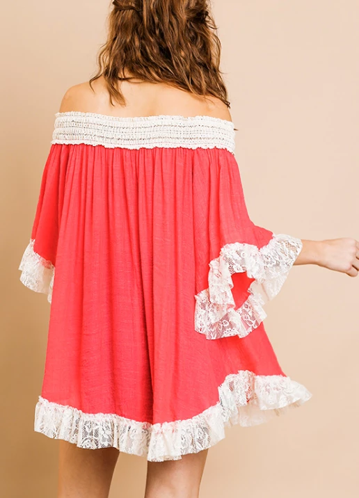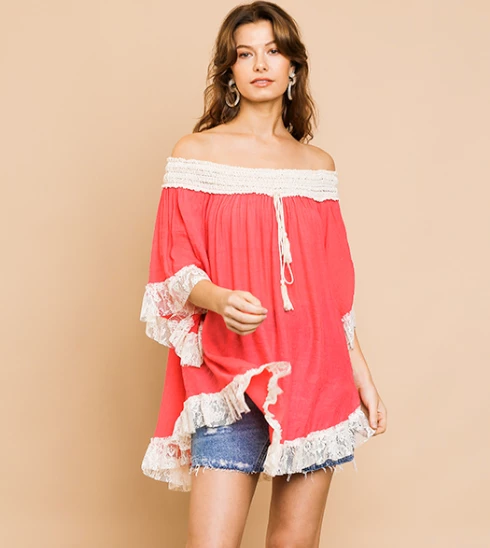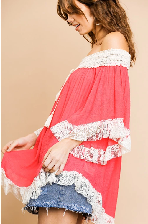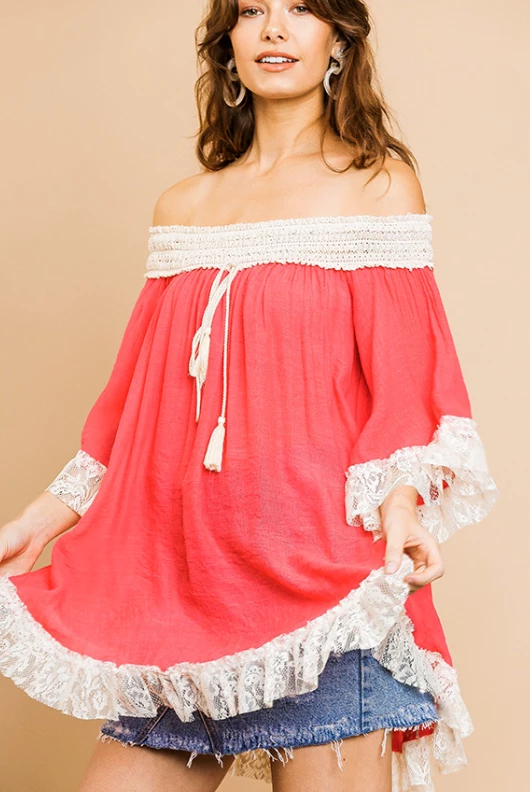 - Bell Sleeve Crochet Off Shoulder Tunic with Floral Lace Scoop Trim and Tassle Tie