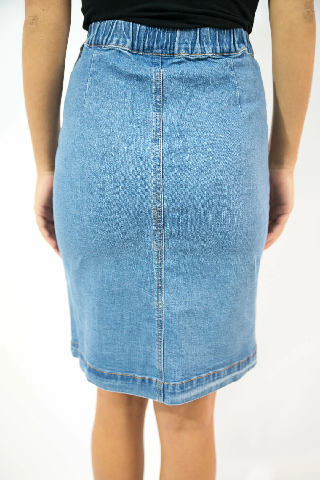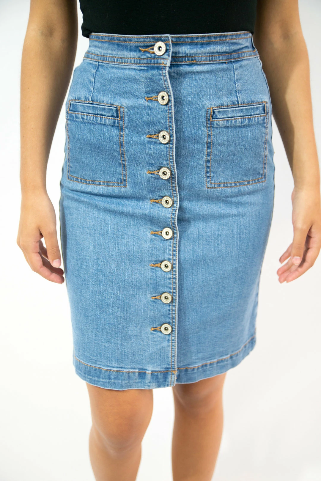 - Our denim stretch button front midi pencil skirt with pockets