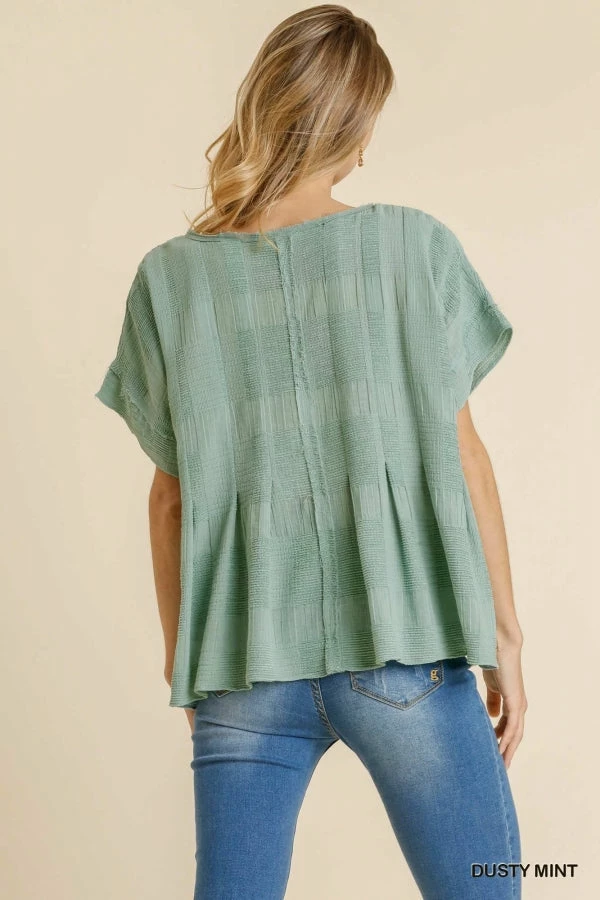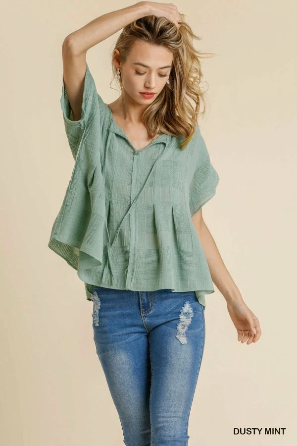- Textured Short Sleeve Front String Tie Top with Raw Edged Details