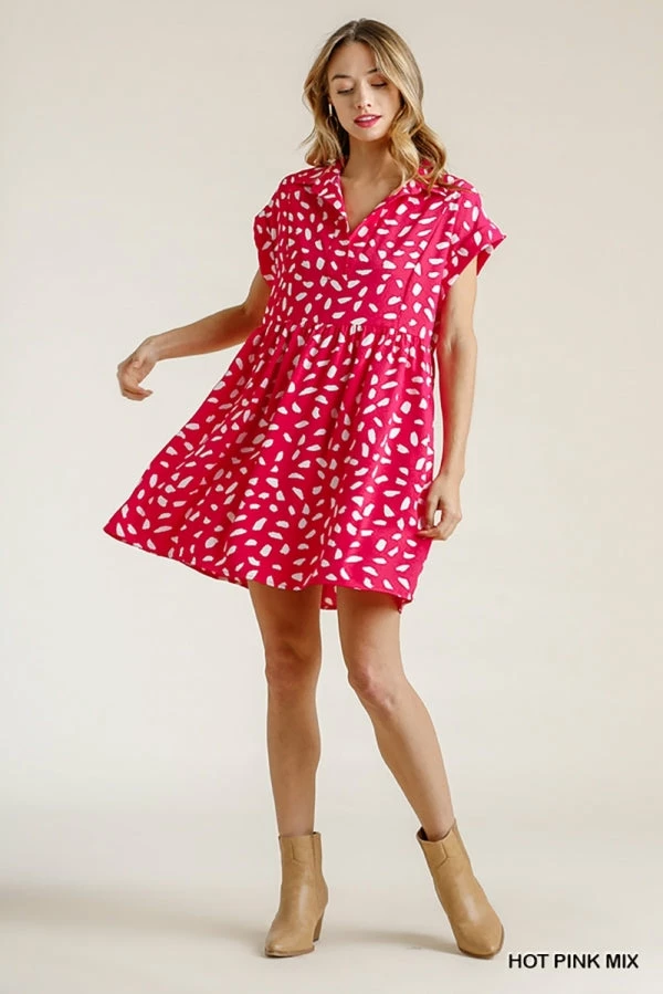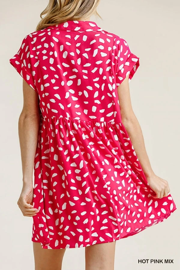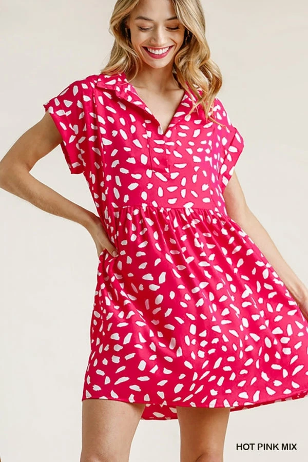 - Dalmatian Print Short Folded Sleeve V-Neck Collared Babydoll Dress
