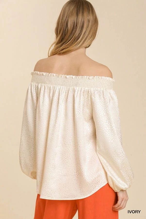 - Animal Jacquard Print Off Shoulder Top with Long Sleeves