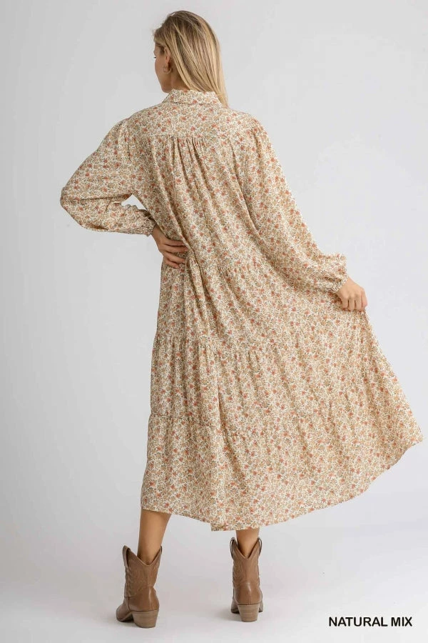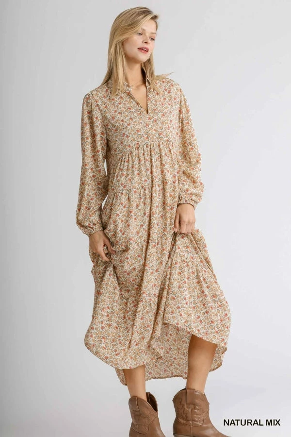 - Floral Print Collar Split Neck Long Puff Sleeve Tiered Maxi Dress with No Lining