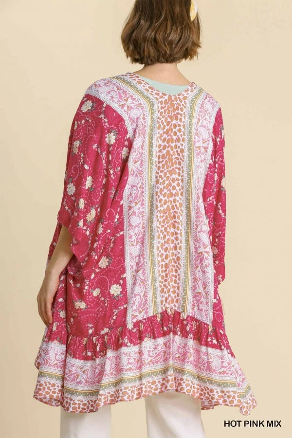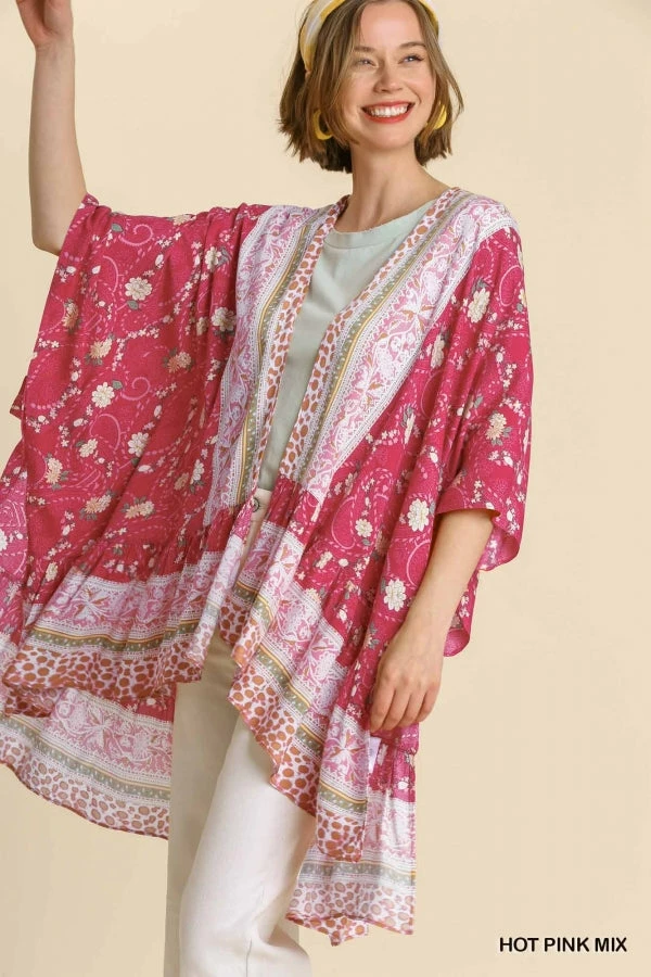 - Mixed Floral & Animal Border Print Bell Sleeve Open Front Kimono with Side Slits and Ruffle Hem