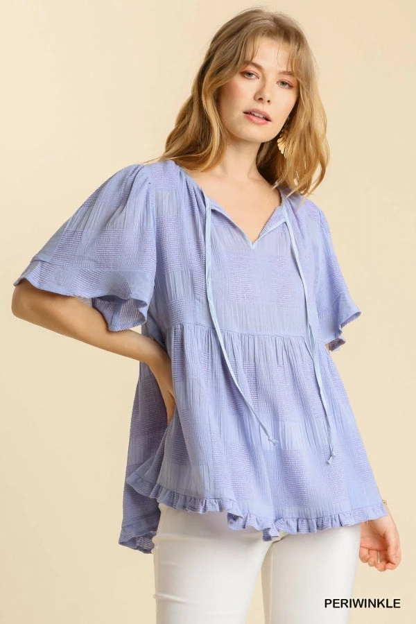 - Sheer Textured Short Flutter Sleeve Front String Tie Babydoll Top with Ruffle Hem