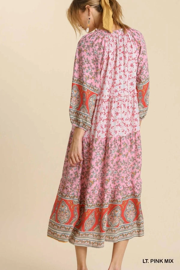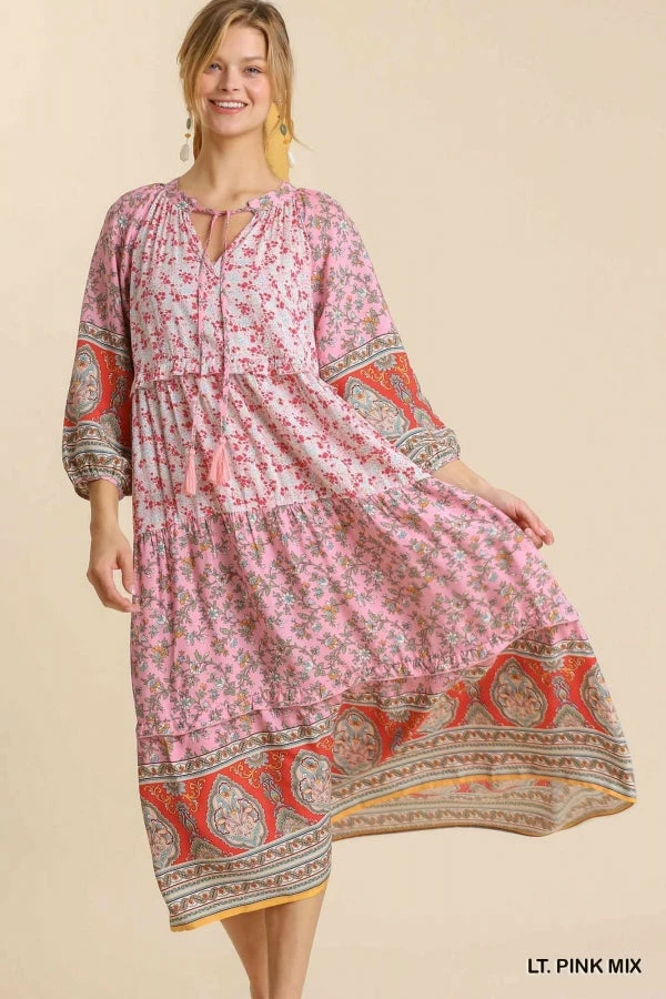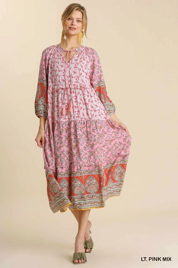 - Mixed Print Long Sleeve Ruffled Maxi Dress with Tassel Front Tie Detail and No Lining