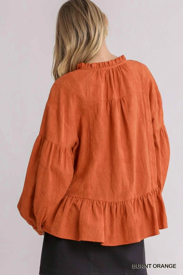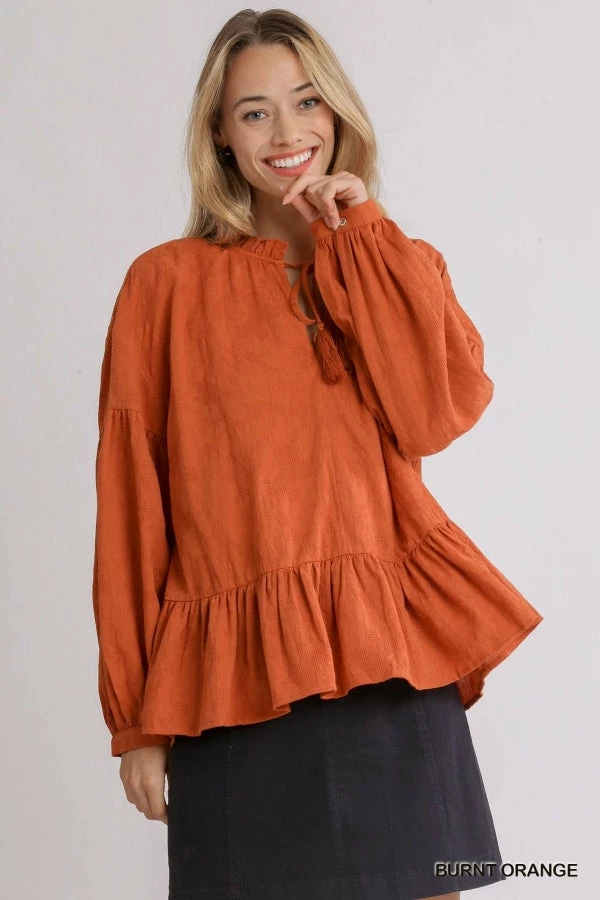 - Textured Ruffle Split Neck Long Sleeve Babydoll Top with Tassel Front Tie Detail