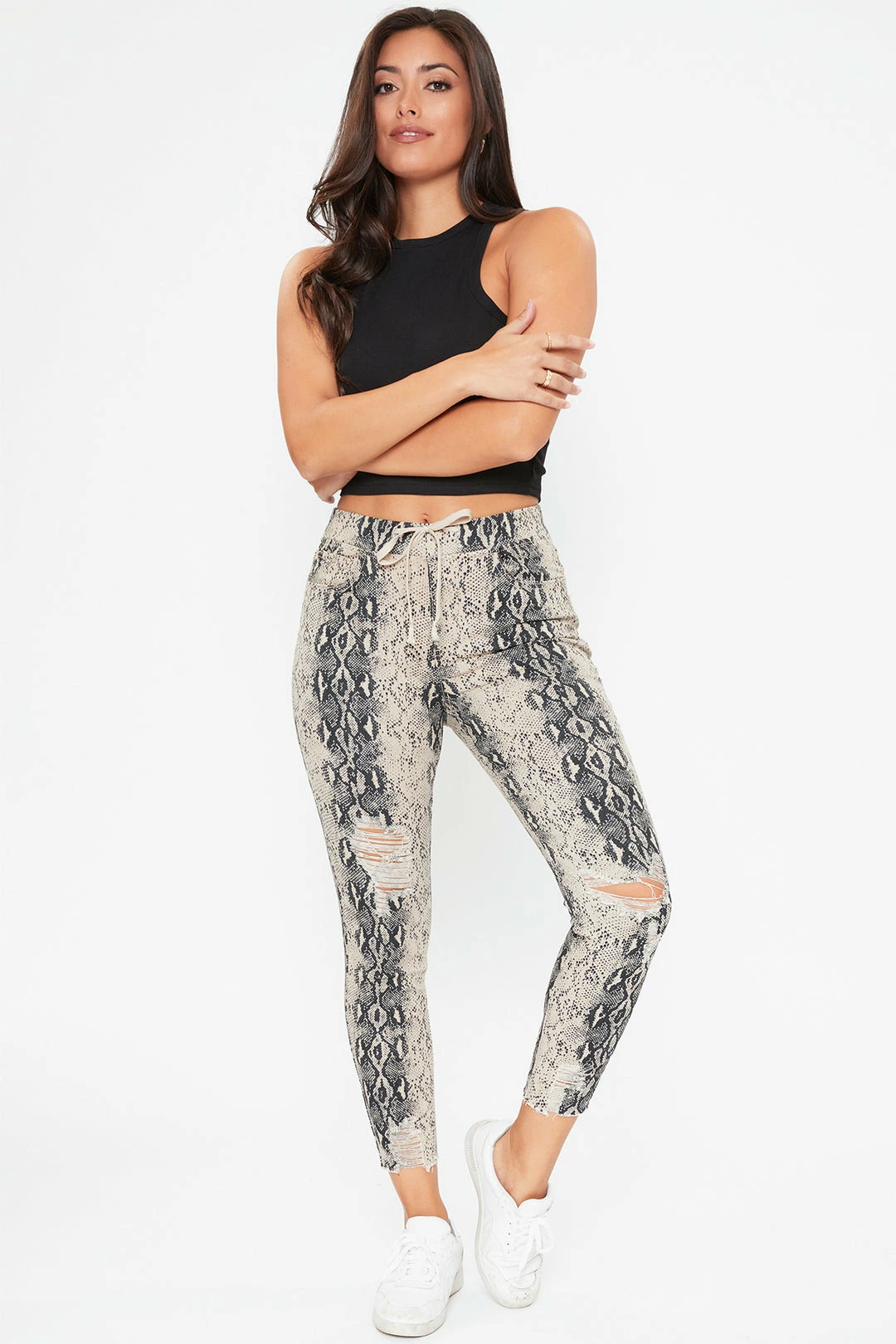 Stay on trend this season in our High-Rise Distressed Ankle Joggers. This pair is a must-have! Dress them up or dress them down… the choice is yours. Featuring classic five-pocket construction, an elastic waistband with drawstring front tie, distressed detailing, and frayed hem.
