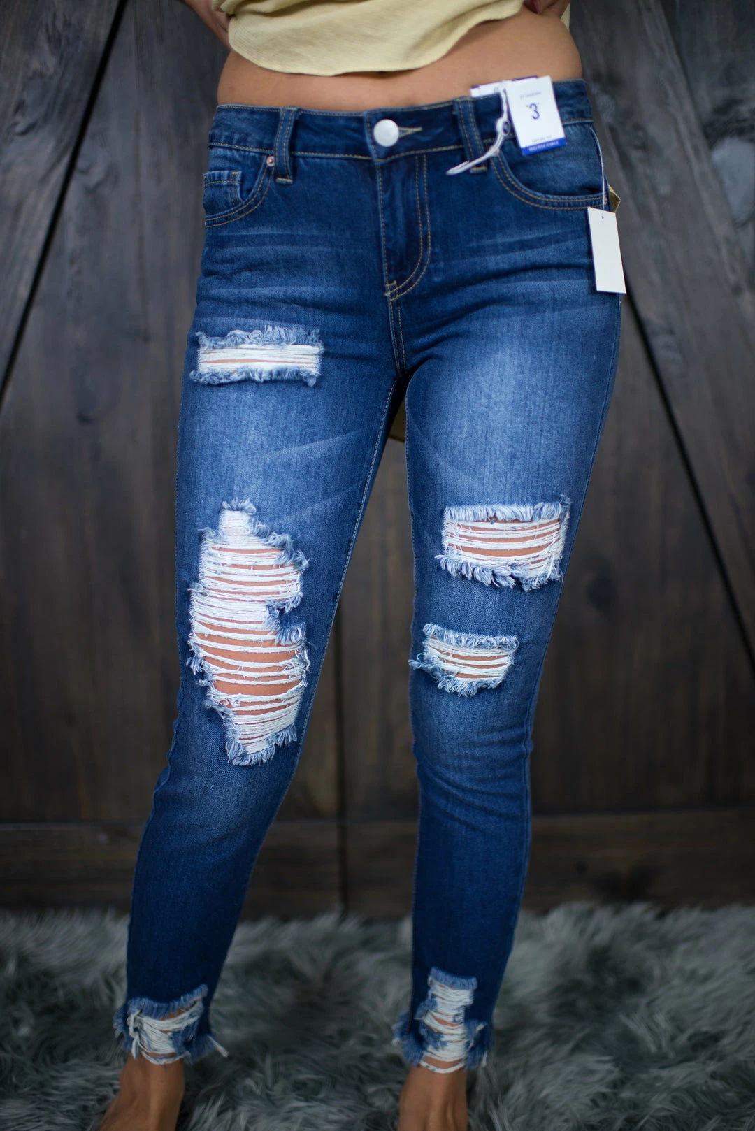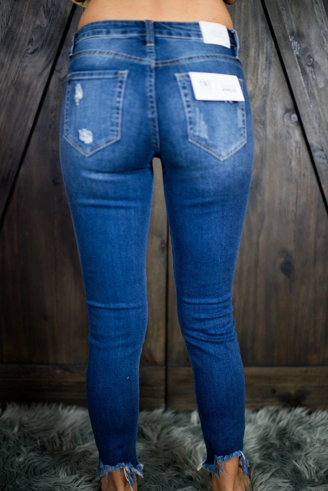 - Hybrid Denim! Perfect distressed, rigid denim on the front and comfortable, butt-hugging, stretch denim on the back. Simply put, the best of both worlds. Featuring a mid-rise fit, hem destruction, 5-pocket construction, single button closure and belt loops.